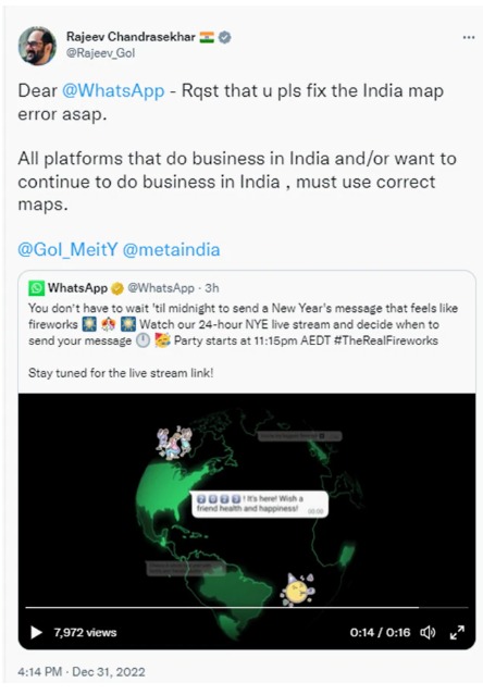 ತಿರುಚಿದ ಭಾರತದ ಭೂಪಟವನ್ನು ಟ್ವೀಟ್ ಮಾಡಿದ್ದಕ್ಕಾಗಿ ವಾಟ್ಸ್ಆಪ್ನ್ನು ಐಟಿ ಸಚಿವರು ತರಾಟೆಗೆ ತೆಗೆದುಕೊಂಡಿದ್ದಾರೆ. ಹೊಸವರ್ಷಕ್ಕೆ ಶುಭಾಶಯ ಕೋರಿ ವಾಟ್ಸಾಪ್ ಸಂಸ್ಧೆ ಮಾಡಿದ ಟ್ವೀಟ್ ವಿಡಿಯೋದಲ್ಲಿ ಭಾರತದ ಭೂಪಟದಲ್ಲಿ ಜಮ್ಮು-ಕಾಶ್ಮೀರದ ಪ್ರದೇಶ ತಪ್ಪಾಗಿ ಹಾಕಲಾಗಿತ್ತು.