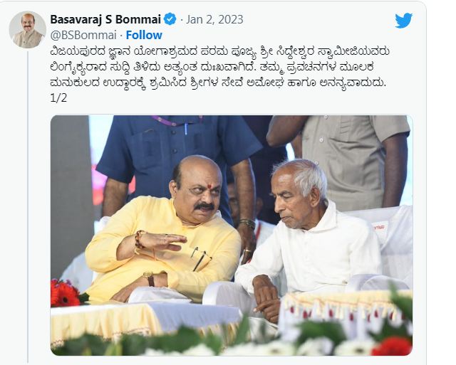 ಜ್ಞಾನಯೋಗಾಶ್ರಮದ ಸಿದ್ದೇಶ್ವರ ಶ್ರೀಗಳು ನಿಧನ ಹೊಂದಿನ ಹಿನ್ನೆಲೆಯಲ್ಲಿ ರಾಷ್ಟ್ರಪತಿ ದ್ರೌಪದಿ ಮುರ್ಮು, ಪ್ರಧಾನಿ ನರೇಂದ್ರ ಮೋದಿ, ಎಐಸಿಸಿ ಮಾಜಿ ಅಧ್ಯಕ್ಷ ರಾಹುಲ್ ಗಾಂಧಿ, ಮಾಜಿ ಪ್ರಧಾನಿ ದೇವೇಗೌಡ, ಮುಖ್ಯಮಂತ್ರಿ ಬಸವರಾಜ ಬೊಮ್ಮಾಯಿ, ಪ್ರತಿಪಕ್ಷದ ನಾಯಕ ಸಿದ್ದರಾಮಯ್ಯ, ಮಾಜಿ ಸಿಎಂ ಎಚ್.ಡಿ.ಕುಮಾರಸ್ವಾಮಿ ಸೇರಿ ಹಲವರು ಕಂಬನಿ ಮಿಡಿದಿದ್ದಾರೆ.