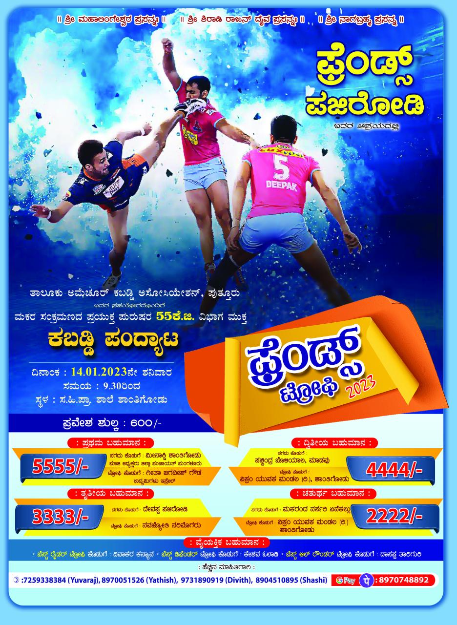 ಪುತ್ತೂರು: ಅಮೆಚ್ಚೂರ್ ಕಬಡ್ಡಿ ಅಸೋಸಿಯೇಶನ್ ಸಹಯೋಗದಲ್ಲಿ , ಶಾಂತಿಗೋಡು ಫ್ರೆಂಡ್ಸ್ ಪಜಿರೋಡಿ ಆಶ್ರಯದಲ್ಲಿ ಮಕರ ಸಂಕ್ರಮಣದ ಪ್ರಯುಕ್ತ ಪುರುಷರ 55 ಕೆ.ಜಿ ವಿಭಾಗದ ಮುಕ್ತ ಕಬಡ್ಡಿ ಪಂದ್ಯಾಟ ಫ್ರೆಂಡ್ಸ್ ಟ್ರೋಫಿ 2023 ಜ. 14ರಂದು ಬೆಳಿಗ್ಗೆ 9.30ರಿಂದ ಶಾಂತಿಗೋಡು ಹಿ.ಪ್ರಾ. ಶಾಲಾ ವಠಾರದಲ್ಲಿ ನಡೆಯಲಿದೆ.