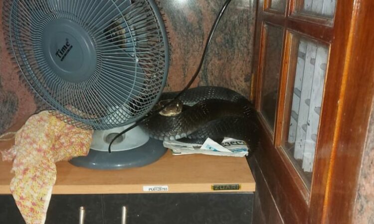 ಬೆಳ್ತಂಗಡಿ : ಮನೆಯೊಳಗಿನ ಟೇಬಲ್ ಫ್ಯಾನ್ ಪಕ್ಕದಲ್ಲಿ ಕಾಳಿಂಗ ಸರ್ಪವೊಂದು ಪತ್ತೆಯಾದ ಘಟನೆ ದಕ್ಷಿಣ ಕನ್ನಡ ಜಿಲ್ಲೆಯ ಬೆಳ್ತಂಗಡಿ ಸಮೀಪದ ಹತ್ಯಡ್ಕ ಎಂಬಲ್ಲಿ ನಡೆದಿದೆ.