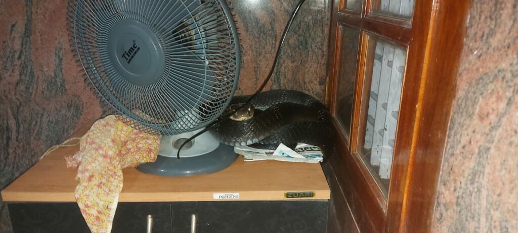 ಹತ್ಯಡ್ಕ ನಿವಾಸಿ ಉಮೇಶ್ ಎಂಬವರ ಮನೆಯ ರೂಂ ನ ಟೇಬಲ್ ಫ್ಯಾನ್ ಪಕ್ಕದಲ್ಲಿ ಸುಮಾರು 10 ಅಡಿ ಉದ್ದದ ಕಾಳಿಂಗ ಸರ್ಪವೊಂದು ಮಲಗಿತ್ತು. ಗಾಬರಿಗೊಂಡ ಮನೆಯವರು ತಕ್ಷಣ ಸ್ಥಳೀಯ ಉರಗ ತಜ್ಞರಾದ ಸ್ನೇಕ್ ಅಶೋಕ್ ಲಾಯಿಲ ಅವರಿಗೆ ಮಾಹಿತಿ ನೀಡಿದ್ದಾರೆ.