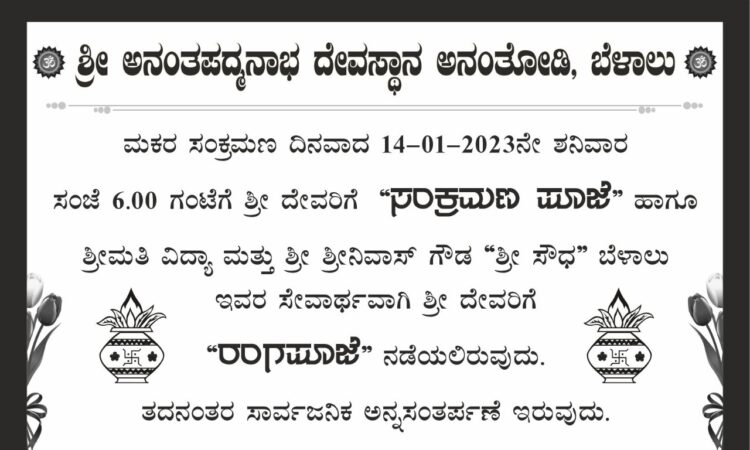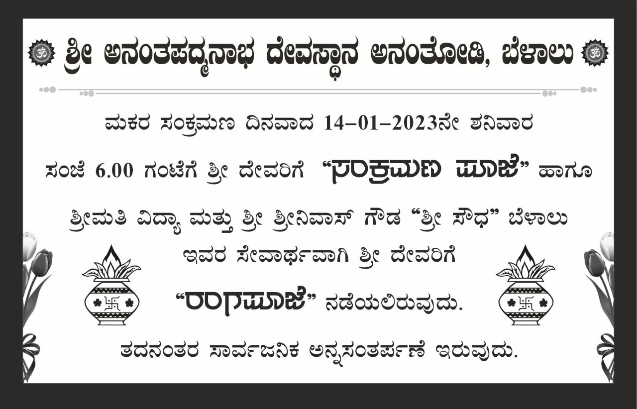 ಶ್ರೀ ಅನಂತಪದ್ಮನಾಭ ಸ್ವಾಮಿ ದೇವಸ್ಥಾನ ಅನಂತೋಡಿ, ಬೆಳಾಲಿನಲ್ಲಿ ಇದೇ ಬರುವ ಜ.14ರಂದು ಸಂಜೆ 7ಗಂಟೆಗೆ ಸಂಕ್ರಮಣ ಪೂಜೆ ನಡೆಯಲಿದೆ. ಹಾಗೂ ರಾತ್ರಿ 7.30ಕ್ಕೆ ಶ್ರೀಮತಿ ವಿದ್ಯಾ ಮತ್ತು ಶ್ರೀ ಶ್ರೀನಿವಾಸ ಗೌಡ ಮತ್ತು ಮನೆಯವರು ಶ್ರೀಸೌಧ ಬೆಳಾಲು ಇವರ ಸೇವಾರ್ಥವಾಗಿ ಶ್ರೀ ದೇವರಿಗೆ ರಂಗ ಪೂಜೆ ಹಾಗೂ ಶ್ರೀ ಶಾಸ್ತಾರ ( ಅಯ್ಯಪ್ಪ) ದೇವರಿಗೆ ಅಪ್ಪ ಸೇವೆಯು ನಡೆಯಲಿದೆ.