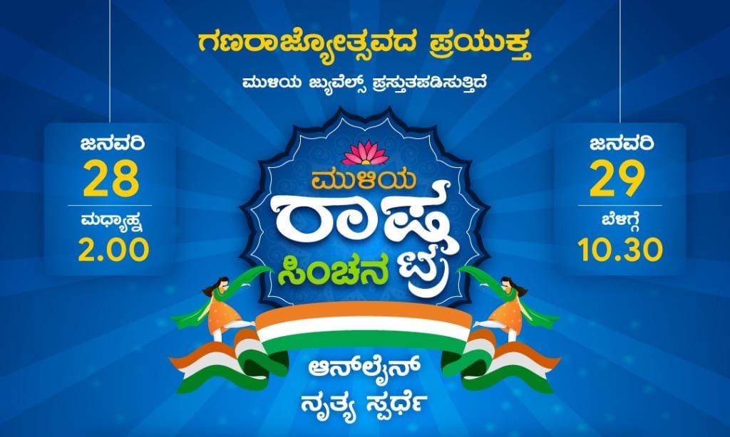 ಗಣಾರಾಜ್ಯೋತ್ಸವದ ಪ್ರಯುಕ್ತ ಪ್ರತಿಷ್ಟಿತ ಚಿನ್ನಭರಣ ಮಳಿಗೆ ಪುತ್ತೂರಿನ ಮುಳಿಯ ಜ್ಯುವೆಲ್ಸ್ ವಿನೂತನ ಕಾರ್ಯಕ್ರಮವೊಂದನ್ನು ಆಯೋಜಿಸ್ತಾ ಇದೆ. ‘ಮುಳಿಯ ರಾಷ್ಟç ಸಿಂಚನ’ ಆನ್ಲೈನ್ ನೃತ್ಯ ಸ್ಪರ್ಧೆಯನ್ನು ಜ.28ರಂದು ಮಧ್ಯಾಹ್ನ 2ಗಂಟೆಗೆ ಮತ್ತು 29ರಂದು ಬೆಳಗ್ಗೆ 10.30ಕ್ಕೆ ಆಯೋಜಿಸಿದೆ.