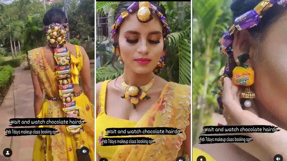 ಭಾರತೀಯ ಮದುವೆಗಳೆಂದರೆ ಸಂಪ್ರದಾಯದ ಬದ್ದವಾಗಿ ನಡೆಯುತ್ತದೆ. ಇತ್ತೀಚಿನ ದಿನಗಳಲ್ಲಿ ಮದುವೆ ಹಲವಾರು ವಿಶೇಷತೆಗಳ ಕೇಂದ್ರಬಿಂದುವಾಗಿ ಬಿಟ್ಟಿದೆ. ಆಧುನಿಕತೆಗೆ ತಕ್ಕುದಾಗಿ ಅವರವರ ಅಭಿರುಚಿಗೆ ತಕ್ಕತೆ ಎಲ್ಲಾ ತಯಾರಿಗಳು ನಡೆಯುತ್ತದೆ. ಅಂತೆಯೇ ಇಲ್ಲೋಬ್ಬಳು ಮಧು ಅರಶಿನ ಶಾಸ್ತ್ರಕ್ಕೆ ರೆಡಿಯಾಗಿದ್ದು ತನ್ನ ಆಭರಣಗಳನ್ನ ಚಾಕೋಲೇಟ್ನಿಂದ ತಯಾರಿಸಿ ಅಲಂಕಾರ ಮಾಡಿಕೊಂಡಿದ್ದಾಳೆ. ಮಿಲ್ಕಿಬಾರ್, ಕ್ಯಾಡ್ಬರಿ, ಫೆರೇರೋ ರೋಚರ್, ಮ್ಯಾಂಗೋ ಬೈಟ್, ಕಿಟ್ಕ್ಯಾಟ್, ಫೈವ್ ಸ್ಟಾರ್ ಹೀಗೆ ಬಗೆ ಬಗೆಯ ಚಾಕೋಲೇಟ್ಗಳಿಂದ ಸರ, ಕಿವಿಯೋಲೆ, ನೆತ್ತಿಬೊಟ್ಟು, ಜಡೆ ಬಿಲ್ಲೆ ತಯಾರಿಸಿ, ಸಿಂಗರಿಸಿಕೊಂಡಿದ್ದಾಳೆ.