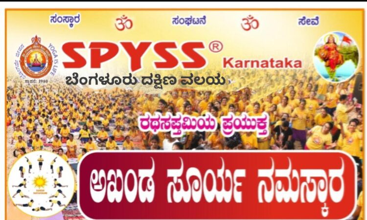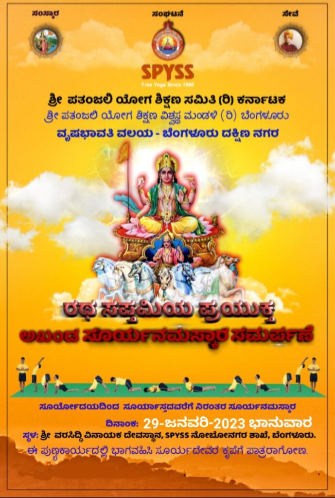 ಬೆಂಗಳೂರು: ಶ್ರೀ ಪತಂಜಲಿ ಯೋಗ ಶಿಕ್ಷಣ ಸಮಿತಿ(ರಿ) ಕರ್ನಾಟಕ, ಶ್ರೀ ಪತಂಜಲಿ ಯೋಗ ಶಿಕ್ಷಣ ವಿಶ್ವಸ್ಥ ಮಂಡಳಿ (ರಿ)ಬೆಂಗಳೂರು ವತಿಯಿಂದ ವೃಷಭಾವತಿ ವಲಯ ಬೆಂಗಳೂರು ದಕ್ಷಿಣ ನಗರ ರಥ ಸಪ್ತಮಿಯ ಪ್ರಯುಕ್ತ, ಅಖಂಡ ಸೂರ್ಯನಮಸ್ಕಾರ ಸಮರ್ಪಣೆ ಕಾರ್ಯಕ್ರಮ 29-1-2023ರಂದು ನಡೆಯಲಿದೆ.