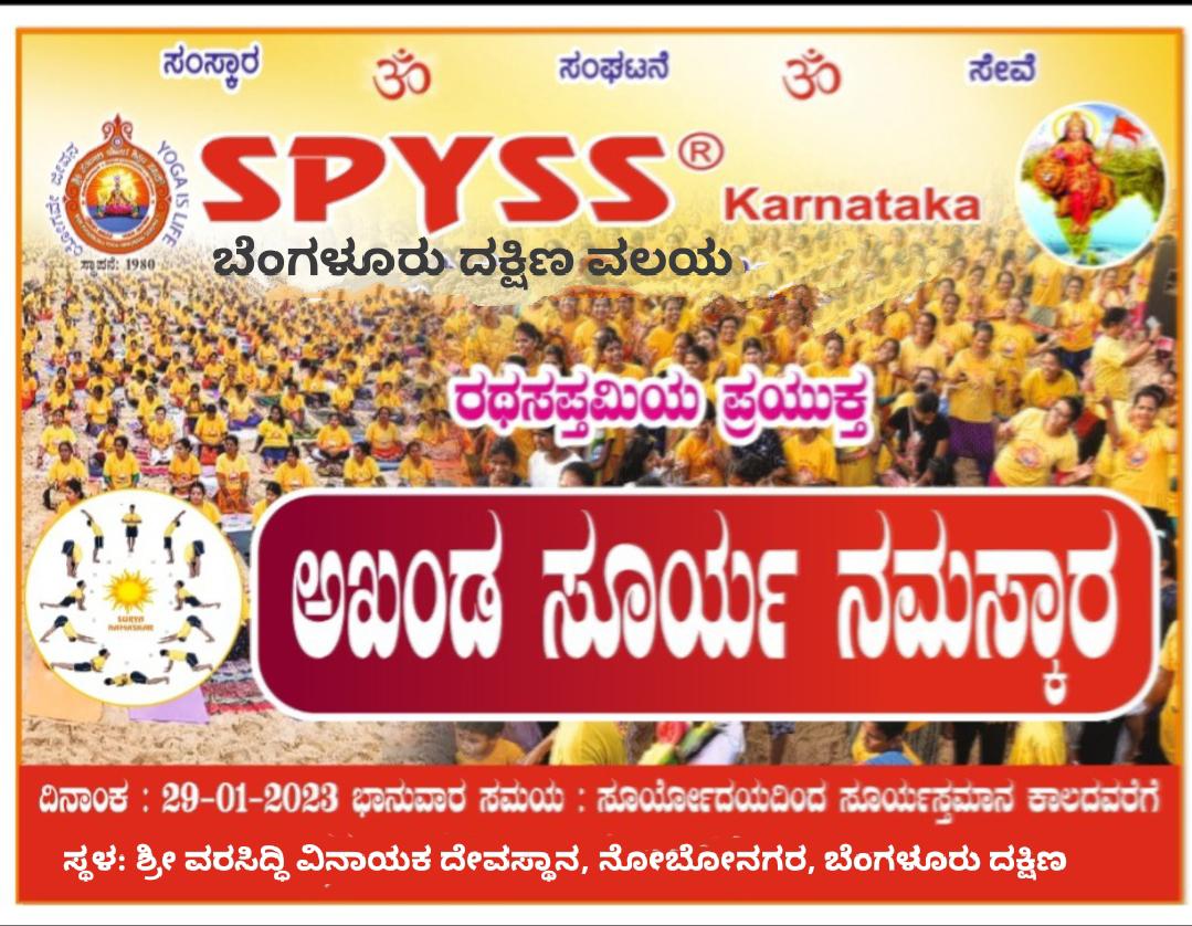 ಬೆಂಗಳೂರಿನ ಎಸ್ಪಿವೈಎಸ್ಎಸ್ ನೋಬೋನಗರ ಶಾಖೆಯ ಶ್ರೀ ವರಸಿದ್ಧಿವಿನಾಯಕ ದೇವಸ್ಥಾನದಲ್ಲಿ ಸೂರ್ಯೋದಯದಿಂದ ಸೂರ್ಯಾಸ್ತದವರೆಗೆ ನಿರಂತರ ಸೂರ್ಯನಮಸ್ಕಾರ ನಡೆಯಲಿದೆ.