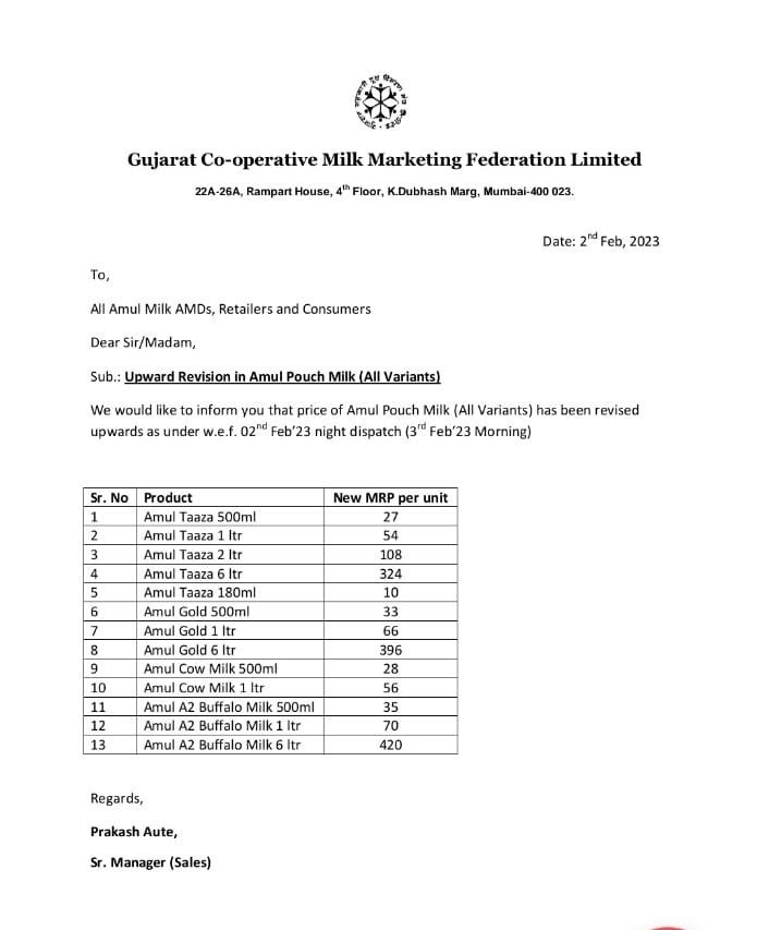 ಫೆಬ್ರವರಿ 3, 2023ರ ಬೆಳಗಿನಿಂದ ಜಾರಿಗೆ ಬರುವಂತೆ ಅಮುಲ್ ಹಾಲಿನ ಪ್ಯಾಕ್ಗಳ ಎಲ್ಲಾ ವಿಧಗಳಲ್ಲಿಯೂ ಬೆಲೆಯನ್ನು ಲೀಟರ್ ಗೆ 3 ರೂಪಾಯಿ ಹೆಚ್ಚಿಸಲಾಗಿದೆ ಎಂದು ಕಂಪನಿಯು ತಿಳಿಸಿದೆ.