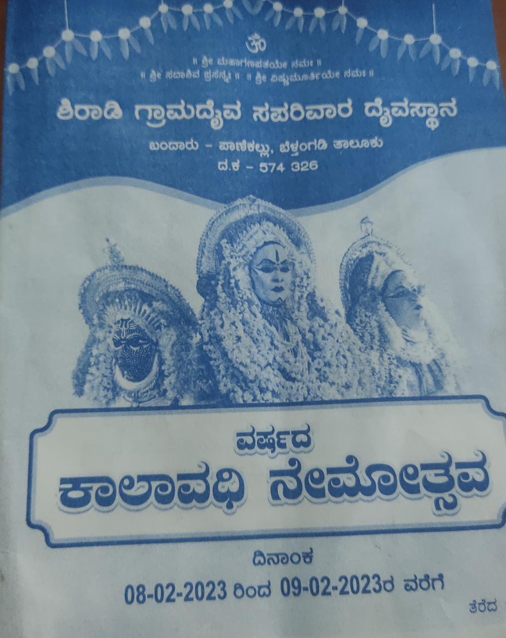 ಬೆಳ್ತಂಗಡಿ ಪಾಣೆಕಲ್ಲು , ಬಂದಾರಿನ ಶ್ರೀ ಶಿರಾಡಿ ಸಪರಿವಾರ ದೈವಗಳ ಸನ್ನಿಧಿಯಲ್ಲಿ ವರ್ಷದ ಕಾಲಾವಧಿ ನೇಮೋತ್ಸವ ಫೆ. 08, 09 ರಂದು ನಡೆಯಲಿದೆ. ನೇಮೋತ್ಸವದ ಪ್ರಯುಕ್ತ ಜ.01 ರಂದು ಗೊನೆ ಮುಹೂರ್ತ ನೆರವೇರಿದೆ.