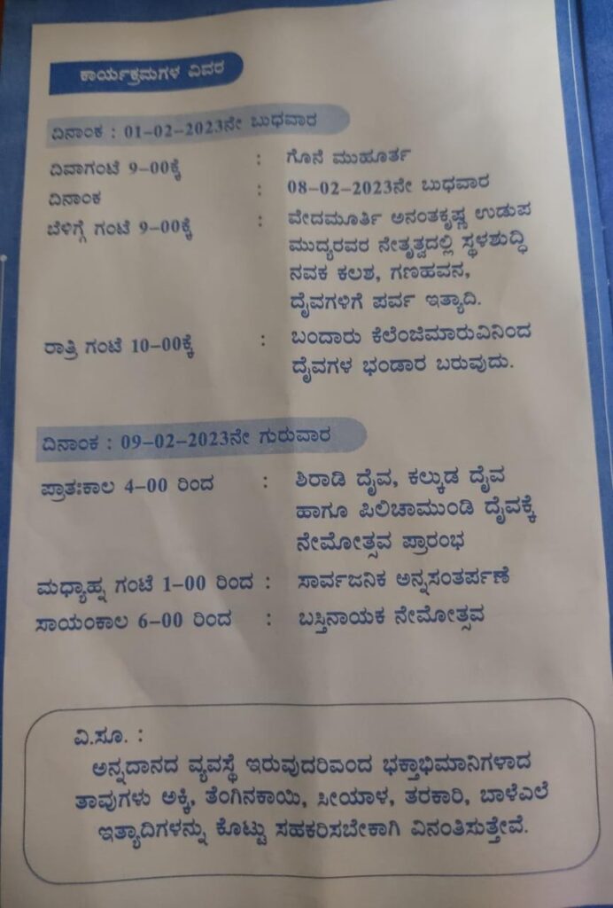 ಫೆ.08 ರಂದು ವೇದಮೂರ್ತಿ ಅನಂತಕೃಷ್ಣ ಉಡುಪ ಮುದ್ಯರವರ ನೇತೃತ್ವದಲ್ಲಿ ಸ್ಥಳ ಶುದ್ದಿ ನವಕ ಕಲಶ, ಗಣಹವನ, ದೈವಗಳಿಗೆ ಪರ್ವ ನಡೆಯಲಿದ್ದು, ರಾತ್ರಿ ಸುಮಾರು 10 ಗಂಟೆಗೆ ಬಂದಾರು ಕೆಲೆಂಜಿಮಾರುವಿನಿAದ ದೈವಗಳ ಭಂಡಾರ ದೈವಸ್ಥಾನಕ್ಕೆ ಬರಲಿದೆ.
