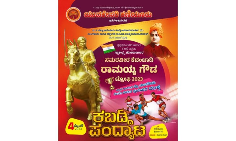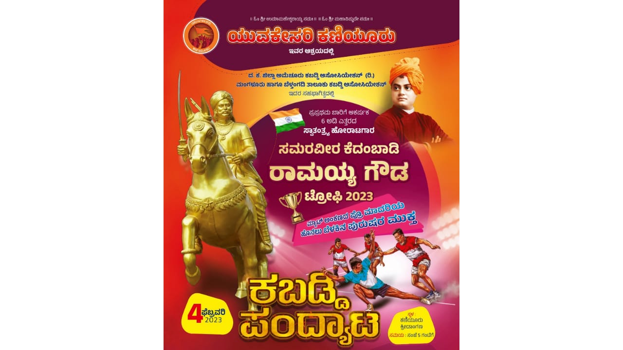 ಯುವಕೇಸರಿ ಕಣಿಯೂರು ಆಶ್ರಯದಲ್ಲಿ ಪ್ರಪ್ರಥಮ ಬಾರಿಗೆ ಆಕರ್ಷಕ 6 ಅಡಿ ಎತ್ತರದ ಸ್ವಾತಂತ್ರ್ಯ ಹೋರಾಟಗಾರ ಸಮರವೀರ ಕೆದಂಬಾಡಿ ರಾಮಯ್ಯ ಗೌಡ ಟ್ರೋಫಿ 2023 ಮ್ಯಾಟ್ ಅಂಕಣದ ಪೆÇ್ರ ಮಾದರಿಯ ಹೊನಲು ಬೆಳಕಿನ ಪುರುಷರ ಮುಕ್ತ ಕಬಡ್ಡಿ ಪಂದ್ಯಾಟ ನಾಳೆ ಕಣಿಯೂರು ಕ್ರೀಡಾಂಗಣದಲ್ಲಿ ನಡೆಯಲಿದೆ.