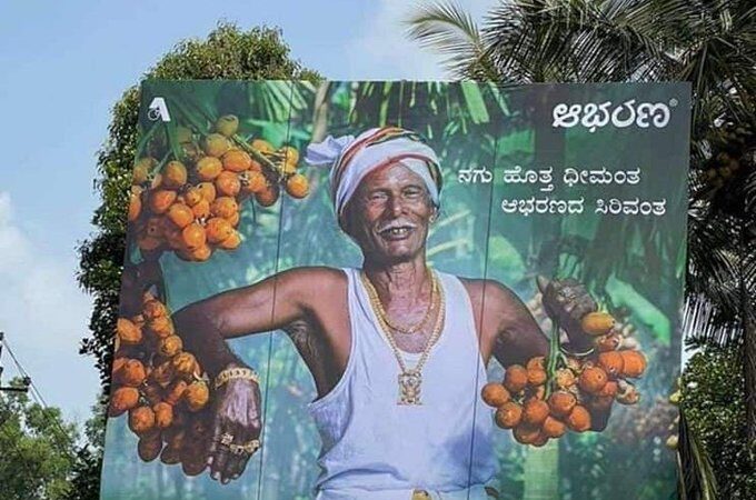 ಹೌದು, ಕರಾವಳಿ ಮಲೆನಾಡು ಎಂದರೆ ಥಟ್ಟನೆ ನೆನಪಾಗುವುದು ಅಡಿಕೆ ಬೆಳೆ. ಬಹುತೇಕ ಮಂದಿ ಅಡಿಕೆ ಬೆಳೆಯನ್ನು ಬೆಳೆದು ಜೀವನ ಸಾಗಿಸುತ್ತಿದ್ದಾರೆ. ಇದೀಗ ಪ್ರತಿಷ್ಠಿತ ‘ಆಭರಣ’ ಮಳಿಗೆ ರೈತನನ್ನು ರೂಪದರ್ಶಿಯಾಗಿ ಬಿಂಬಿಸಿದೆ. ಕೈಯಲ್ಲಿ ಅಡಿಕೆ ಗೊನೆ ಹಿಡಿದಿರುವ ಕೃಷಿಕನಿಗೆ ಚಿನ್ನ ತೊಡಿಸಿ ಜಾಹೀರಾತಿಗಾಗಿ ಫೋಟೋಶೂಟ್ ಮಾಡಿಸಿದ್ದು, ಬಹಳ ಸುಂದರವಾಗಿ ಮೂಡಿಬಂದಿದೆ.
