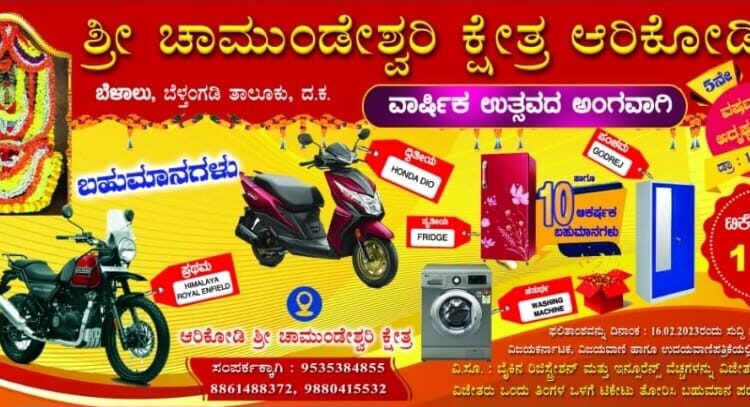ಶ್ರೀ ಚಾಮುಂಡೇಶ್ವರಿ ಕ್ಷೇತ್ರ ಆರಿಕೋಡಿ ಬೆಳಾಲಿನಲ್ಲಿ ಈಗಾಗಲೇ ಜಾತ್ರಾ ಮಹೋತ್ಸವದ ಸಂಭ್ರಮ ಸಂಪನ್ನಗೊAಡಿದ್ದು, ಇದೀಗ ಲಕ್ಕಿಡಿಪ್ ಫಲಿತಾಂಶ ಹೊರಬಿದ್ದಿದೆ. ಪ್ರಥಮ ಬಹುಮಾನವನ್ನು 27250 ನಂಬರ್ನ ಲಕ್ಕಿಡಿಪ್ ಹೊಂದಿರುವವರು ಪಡೆದುಕೊಂಡಿದ್ದು, ಹಿಮಾಲಯ ರಾಯಲ್ ಫೀಲ್ಡ್ ಬೈಕ್ನ್ನು ತಮ್ಮದಾಗಿಸಿಕೊಂಡಿದ್ದಾರೆ.