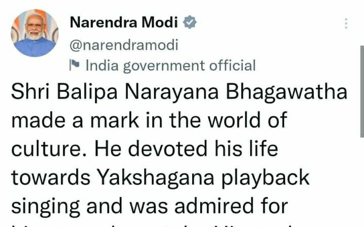 “ಬಲಿಪ ನಾರಾಯಣ ಭಾಗವತರು ಸಾಂಸ್ಕೃತಿಕ ಲೋಕದಲ್ಲಿ ಛಾಪು ಮೂಡಿಸಿದ್ದಾರೆ. ಅವರು ಯಕ್ಷಗಾನ ಹಿನ್ನೆಲೆ ಗಾಯನಕ್ಕಾಗಿ ತಮ್ಮ ಜೀವನವನ್ನು ಮುಡಿಪಾಗಿಟ್ಟರು ಮತ್ತು ಅವರ ಅನುಕರಣೀಯ ಶೈಲಿಯಿಂದ ಮೆಚ್ಚುಗೆ ಪಡೆದರು. ಅವರ ಕೃತಿಗಳನ್ನು ಮುಂದಿನ ಪೀಳಿಗೆಯವರು ಮೆಚ್ಚಿಕೊಳ್ಳಲಿದ್ದಾರೆ. ಅವರ ನಿಧನದಿಂದ ನಮಗೆ ತುಂಬಾ ನೋವು ಆಗಿದೆ ಎಂದು ಪ್ರಧಾನಿ ಮೋದಿ ಟ್ವೀಟ್ ಮಾಡಿದ್ದಾರೆ.