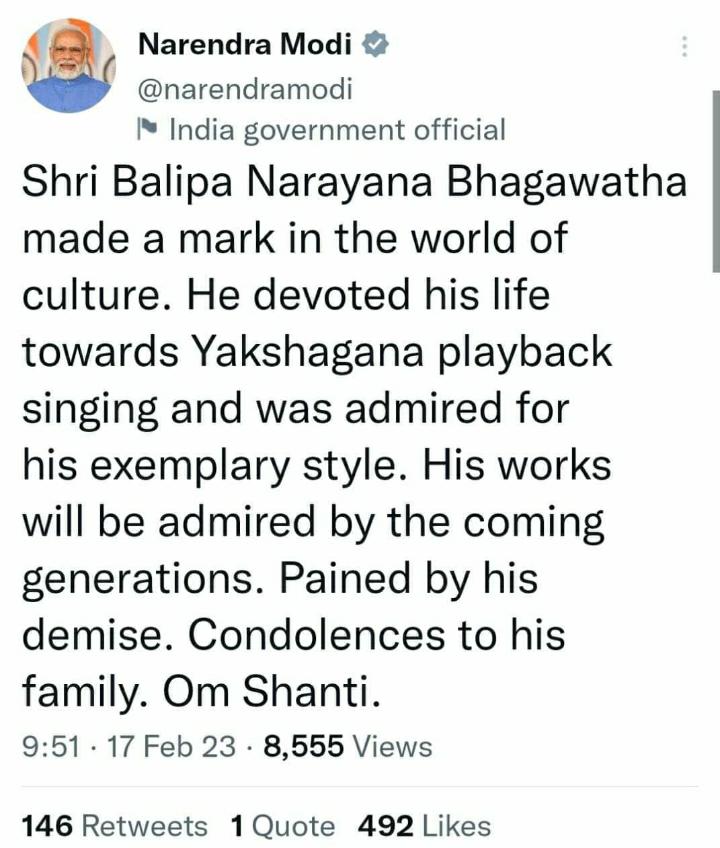 “ಬಲಿಪ ನಾರಾಯಣ ಭಾಗವತರು ಸಾಂಸ್ಕೃತಿಕ ಲೋಕದಲ್ಲಿ ಛಾಪು ಮೂಡಿಸಿದ್ದಾರೆ. ಅವರು ಯಕ್ಷಗಾನ ಹಿನ್ನೆಲೆ ಗಾಯನಕ್ಕಾಗಿ ತಮ್ಮ ಜೀವನವನ್ನು ಮುಡಿಪಾಗಿಟ್ಟರು ಮತ್ತು ಅವರ ಅನುಕರಣೀಯ ಶೈಲಿಯಿಂದ ಮೆಚ್ಚುಗೆ ಪಡೆದರು. ಅವರ ಕೃತಿಗಳನ್ನು ಮುಂದಿನ ಪೀಳಿಗೆಯವರು ಮೆಚ್ಚಿಕೊಳ್ಳಲಿದ್ದಾರೆ. ಅವರ ನಿಧನದಿಂದ ನಮಗೆ ತುಂಬಾ ನೋವು ಆಗಿದೆ ಎಂದು ಪ್ರಧಾನಿ ಮೋದಿ ಟ್ವೀಟ್ ಮಾಡಿದ್ದಾರೆ.