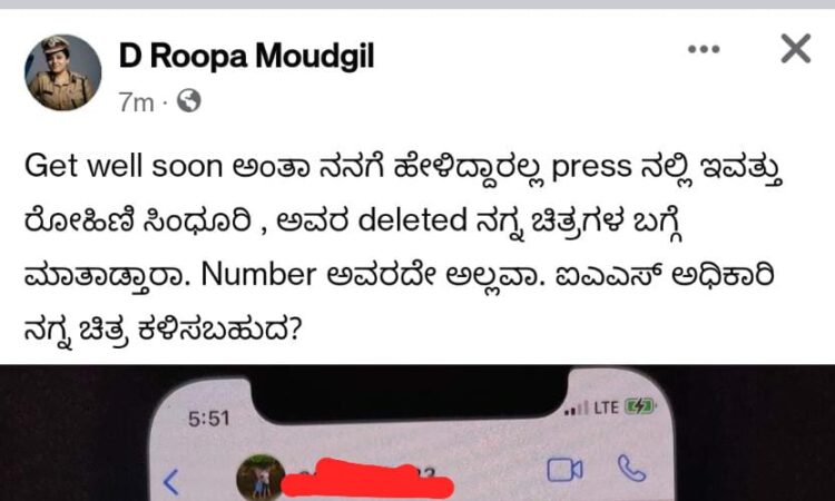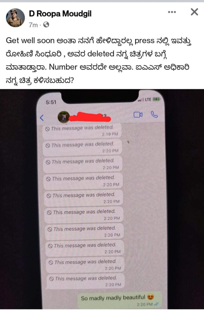 ರೋಹಿಣಿ ಸಿಂಧೂರಿ ಅವರ ಡಿಲಿಟೆಡ್ ನಗ್ನ ಚಿತ್ರಗಳ ಬಗ್ಗೆ ಮಾತಾಡ್ತಾರಾ..? ನಂಬರ್ ಅವರದ್ದೇ ಅಲ್ಲವಾ. ಐಎಎಸ್ ಅಧಿಕಾರಿ ನಗ್ನ ಚಿತ್ರ ಕಳಿಸಬಹುದಾ..? – ವಾಟ್ಸಾಪ್ ಸ್ಟ್ರೀನ್ ಶಾಟ್ ಶೇರ್ ಮಾಡಿದ ಐಪಿಎಸ್ ಅಧಿಕಾರಿ ಡಿ. ರೂಪಾ