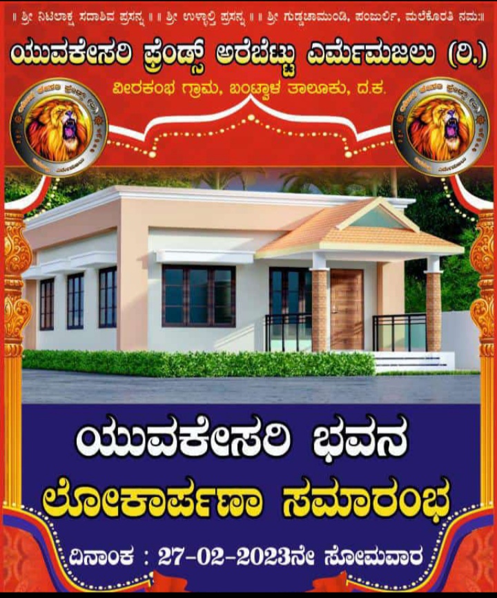 ಬಂಟ್ವಾಳ : ವೀರಕಂಬ ಗ್ರಾಮದ ಯುವ ಕೇಸರಿ ಫ್ರೆಂಡ್ಸ್ ಅರೆಬೆಟ್ಟು ಎರ್ಮೆಮಜಲು (ರಿ) ಇದರ ವತಿಯಿಂದ ಎರ್ಮೆಮಜಲು ಜಂಕ್ಷನ್ ನಲ್ಲಿ ನಿರ್ಮಾಣವಾದ “ಯುವ ಕೇಸರಿ ಭವನ” ದ ಲೋಕಾರ್ಪಣ ಕಾರ್ಯಕ್ರಮ ನಡೆಯಲಿದೆ.