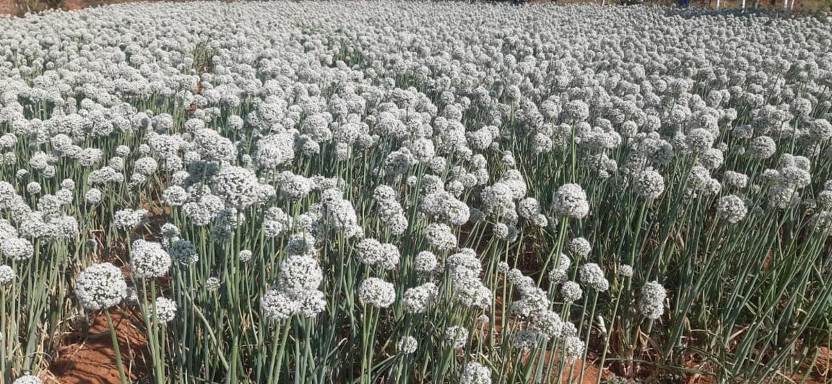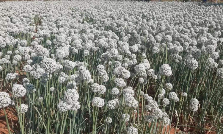 ಹಚ್ಚ ಹಸಿರಾದ ಈರುಳ್ಳಿ ತೊಂಡೆಯ ಮೇಲೆ ಬಿಳಿ ಬಣ್ಣದ ಹೂವಿನ ಗುಚ್ಛ ನೋಡುಗರನ್ನು ತನ್ನತ್ತ ಸೆಳೆಯುತ್ತಿದೆ.
