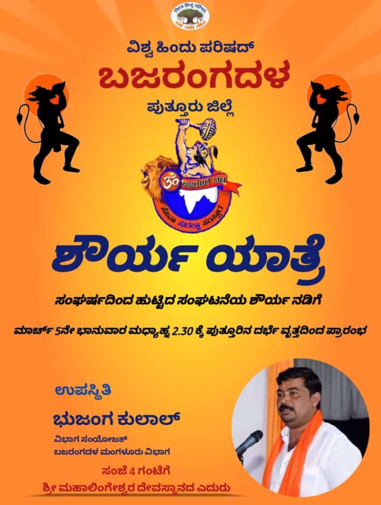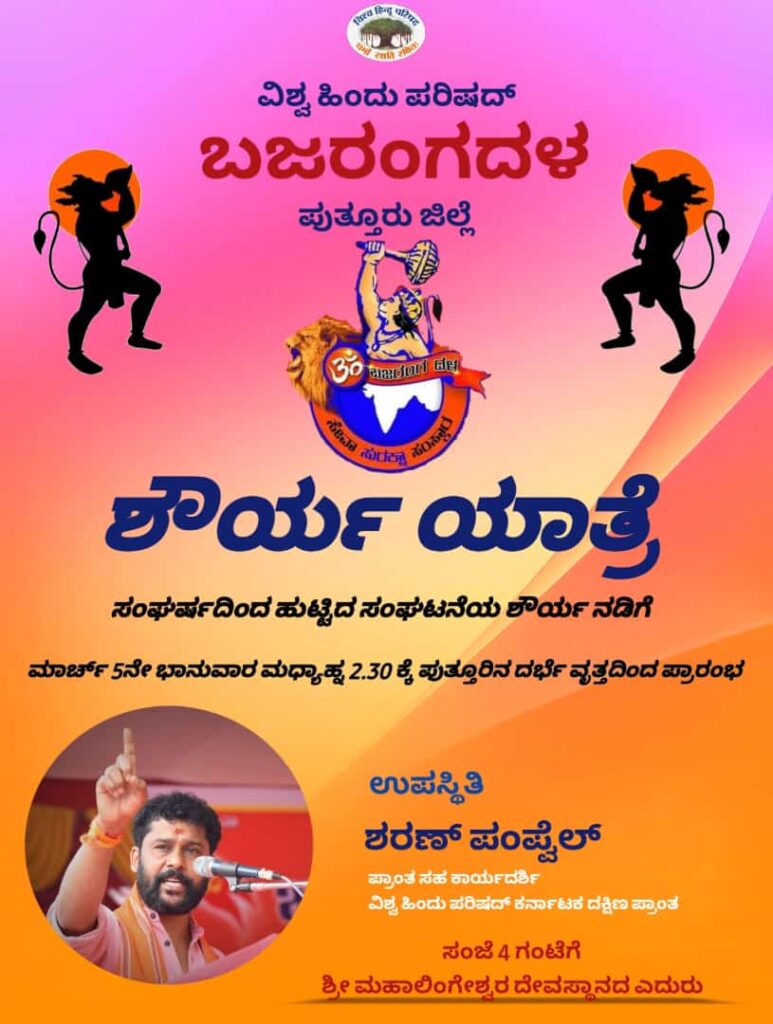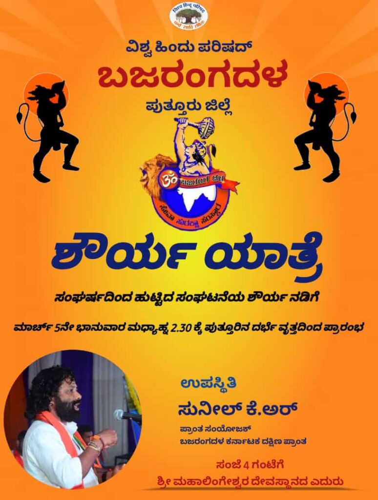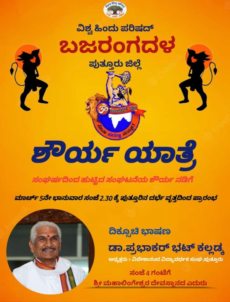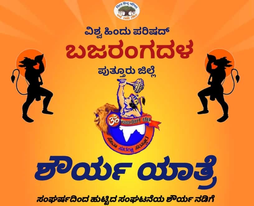 ಪುತ್ತೂರು : ವಿಶ್ವ ಹಿಂದೂ ಬಜರಂಗದಳ ಇದರ ಮುಂದಾಳತ್ವದಲ್ಲಿ ಇದೇ ಮಾರ್ಚ್ 5ರಂದು ವಿಶ್ವಹಿಂದೂ ಬಜರಂಗದಳ ಪುತ್ತೂರು ಇದರ ವತಿಯಿಂದ ಶೌರ್ಯ ಯಾತ್ರೆ ನಡೆಯಲಿದೆ. ದರ್ಬೆ ವೃತ್ತದಿಂದ ಆರಂಭಗೊಂಡು ಪುತ್ತೂರು ಶ್ರೀ ಮಹಾಲಿಂಗೇಶ್ವರ ದೇವಾಳಯದ ವರೆಗೆ ಶೌರ್ಯ ಯಾತ್ರೆ ನಡೆಯಲಿದೆ.