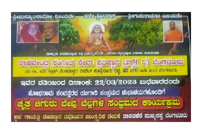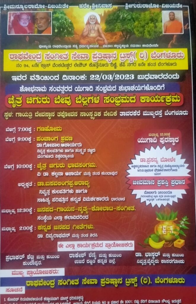 ಬೆಂಗಳೂರು ರಾಘವೇಂದ್ರ ಸಂಗೀತ ಸೇವಾ ಪ್ರತಿಷ್ಠಾನ ಟ್ರಸ್ಟ್ (ರಿ.) ಇವರ ವತಿಯಿಂದ ಮಾ. 22 ರಂದು ‘ಚೈತ್ರ ಚಿಗುರು ಬೇವು ಬೆಲ್ಲಗಳ ಸಂಭ್ರಮ’ – ಕಹಳೆ ನ್ಯೂಸ್