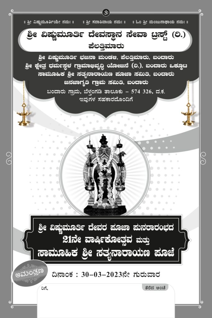 ಬಂದಾರು- ಪೆಲತ್ತಿಮಾರು ಶ್ರೀ ವಿಷ್ಣುಮೂರ್ತಿ ದೇವರ ಪೂಜಾ ಪುನರಾರಂಭದ 21 ನೇ ವಾರ್ಷಿಕೋತ್ಸವ ಹಾಗೂ ಸಾಮೂಹಿಕ ಶ್ರೀ ಸತ್ಯನಾರಾಯಣ ಪೂಜೆ ಇದೇ ಬರುವ ಮಾ. 30 ರಂದು ನಡೆಯಲಿದೆ.