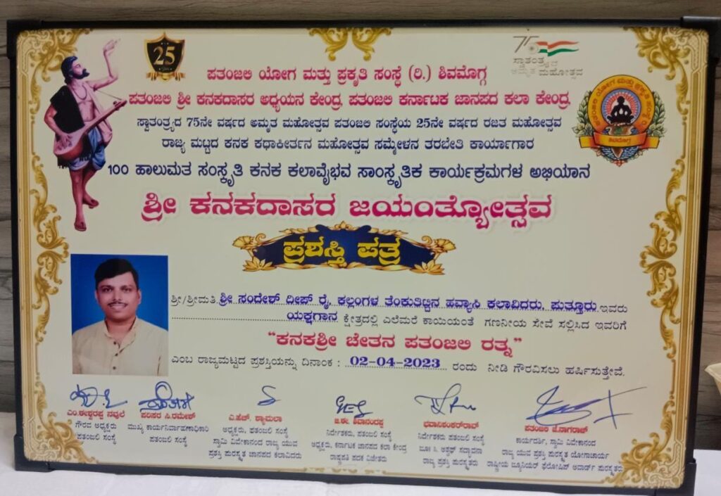 ಪತಂಜಲಿ ಯೋಗ ಮತ್ತು ಪ್ರಕೃತಿ ಸಂಸ್ಧೆ(ರಿ.) ಶಿವಮೊಗ್ಗ, ಪತಂಜಲಿ ಕನಕದಾಸ ಅಧ್ಯಯನ ಕೇಂದ್ರ ಪತಂಜಲಿ ಕರ್ನಾಟಕ ಜಾನಪದ ಕಲಾ ಕೇಂದ್ರ, ಸ್ವಾತಂತ್ರ್ಯದ 75ನೇ ವರ್ಷದ ಅಮೃತ ಮಹೋತ್ಸವ ಪತಂಜಲಿ ಸಂಸ್ಧೆಯ 25ನೇ ವರ್ಷದ ರಜತ ಮಹೋತ್ಸವ ರಾಜ್ಯ ಮಟ್ಟದ ಕನಕ ಕಥಾಸಂಕೀರ್ತನೆ ಮಹೋತ್ಸವ ಸಮ್ಮೇಳನ ತರಬೇತಿ ಕಾರ್ಯಗಾರ, 100 ಹಾಲುಮತ ಸಂಸ್ಕೃತಿ ಕನಕ ಕಲಾವೈಭವ ಸಾಂಸ್ಕೃತಿಕ ಕಾರ್ಯಕ್ರಮಗಳ ಅಭಿಯಾನ, ಶ್ರೀ ಕನಕದಾಸರ ಜಯಂತ್ಯೋತ್ಸವ ಕಾರ್ಯಕ್ರಮದಲ್ಲಿ, ಯಕ್ಷಗಾನ ಕ್ಷೇತ್ರದಲ್ಲಿ ಎಲೆಮರೆಯ ಕಾಯಿಯಂತೆ ಗಣನೀಯ ಸೇವೆ ಸಲ್ಲಿಸಿದ ತೆಂಕುತಿಟ್ಟಿನ ಹವ್ಯಾಸಿ ಕಲಾವಿದ ಸಂದೇಶ್ ದೀಷ್ ರೈ ಕಲ್ಲಂಗಳ ಪುತ್ತೂರು ಇವರಿಗೆ, ರಾಜ್ಯಮಟ್ಟದ ಕನಕ ಶ್ರೀ ಚೇತನ ಪತಂಜಲಿ ರತ್ನ ಪ್ರಶಸ್ತಿ ಪ್ರಧಾನ ಮಾಡಲಾಗಿದೆ.