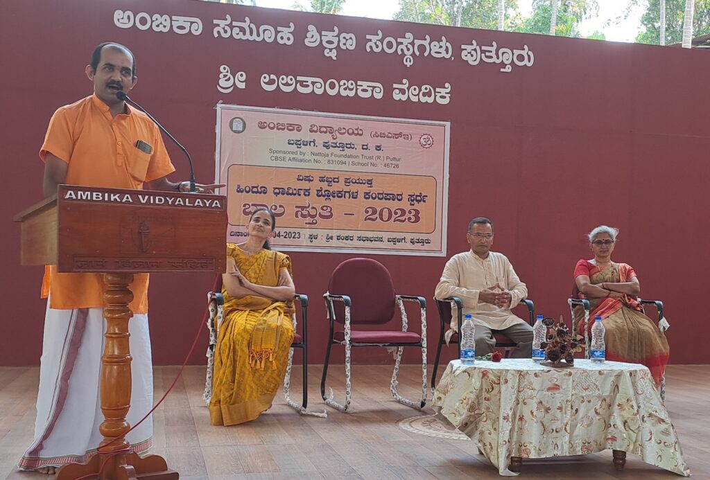 ಅವರು ನಗರದ ನಟ್ಟೋಜ ಫೌಂಡೇಶನ್ ಟ್ರಸ್ಟ್ ಮುನ್ನಡೆಸುತ್ತಿರುವ ಬಪ್ಪಳಿಗೆಯಲ್ಲಿನ ಅಂಬಿಕಾ ವಿದ್ಯಾಲಯ ಸಿಬಿಎಸ್ಇ ಸಂಸ್ಥೆಯ ವತಿಯಿಂದ ಆಯೋಜಿಸಲಾದ ಹಿಂದೂ ಧಾರ್ಮಿಕ ಶ್ಲೋಕಗಳ ಕಂಠಪಾಠ ಸ್ಪರ್ಧೆ – ಬಾಲಸ್ತುತಿ 2023 ಅನ್ನು ಉದ್ಘಾಟಿಸಿ ಮಾತನಾಡಿದರು.