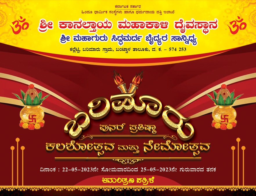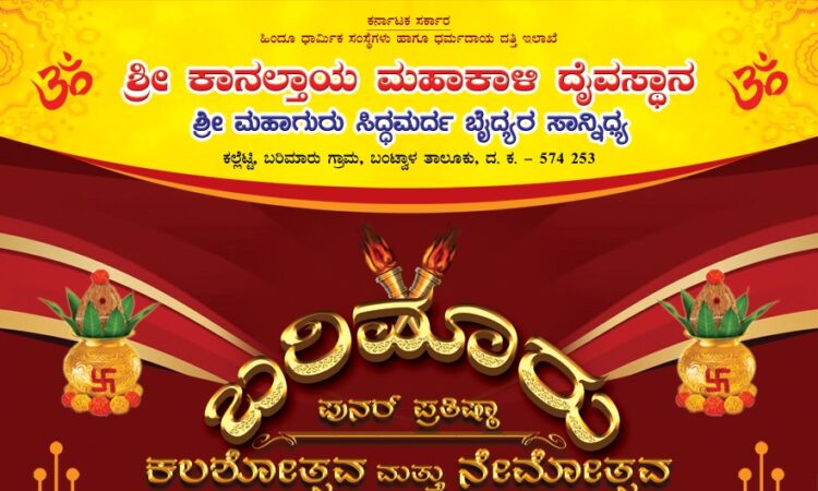 ಬಂಟ್ವಾಳ : ಬರಿಮಾರು ಗ್ರಾಮದ ಶ್ರೀ ಕಾನಲ್ತಾಯ ಮಹಾಕಾಳಿ ದೈವಸ್ಥಾನ ಶ್ರೀ ಮಹಾಗುರು ಸಿದ್ಧಮರದ ಬೈದ್ಯರ ಸಾನಿಧ್ಯ ಕಲ್ಲೆಟ್ಟಿಯಲ್ಲಿ ಮೇ 22ರಿಂದ 25ರ ವರೆಗೆ ಜರಗಲಿರುವ ಪುನರ್ ಪ್ರತಿಷ್ಠಾ ಬ್ರಹ್ಮಕಲಶೋತ್ಸವ ಮತ್ತು ನೇಮೋತ್ಸವ ನಡೆಯಲಿದೆ.
