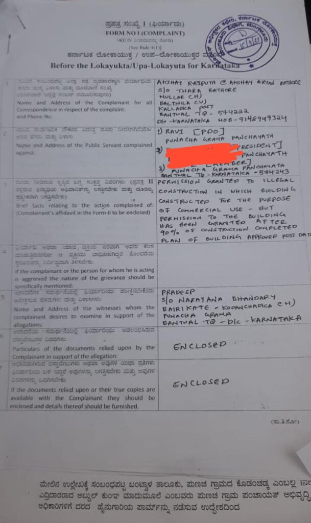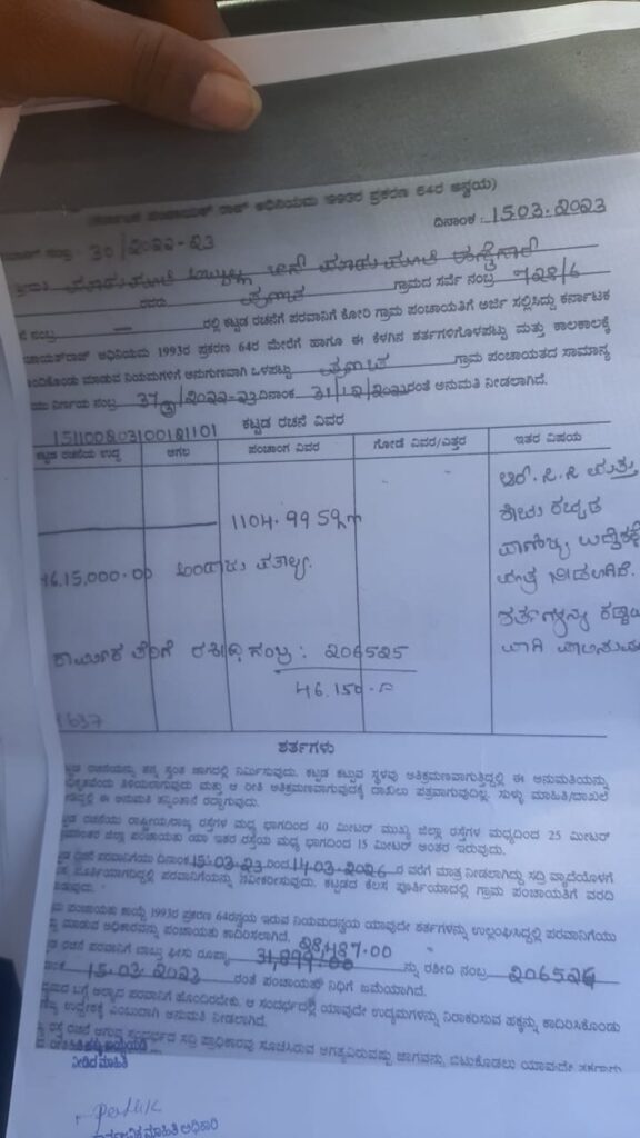 9/11 ರ ಪರವಾನಿಗೆ ಪಡೆಯುವುದಕ್ಕೆ ಮುಂಚೆನೇ ಕಟ್ಟಡ ನಿರ್ಮಾಣ ಪೂರ್ತಿಗೊಂಡಿದ್ದು ಇದರಲ್ಲಿ ಪಂಚಾಯತ್ ಅಧಿಕಾರಿಗಳು ಶಾಮಿಲಾಗಿರುವ ಸಾಧ್ಯತೆ ಇದೆ ಹಾಗೂ ಇದರ ವಿರುದ್ಧ ತಕ್ಷಣ ಕ್ರಮ ಕೈಗೊಳ್ಳುವ ಅಗತ್ಯವಿದೆ.