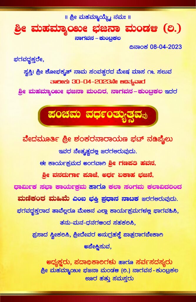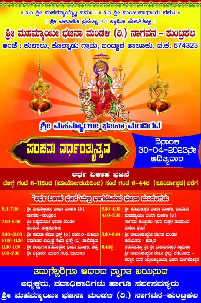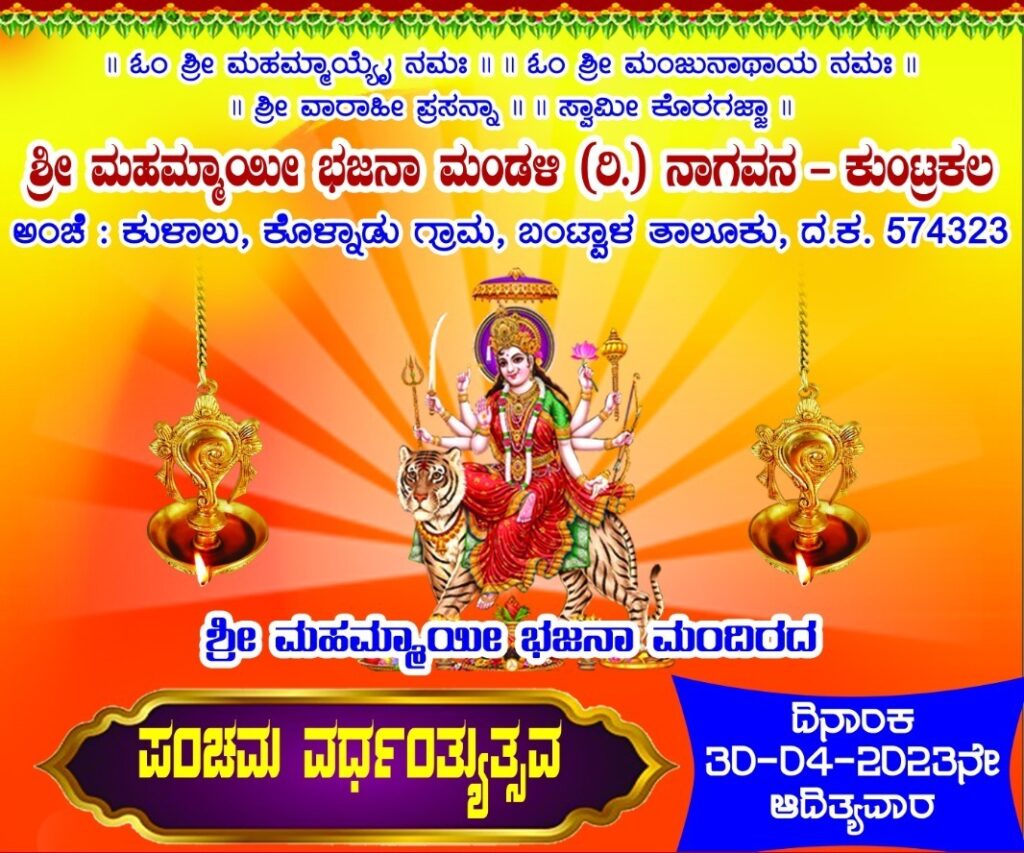 ಶ್ರೀ ಮಹಮ್ಮಾಯೀ ಭಜನಾ ಮಂದಿರ, ನಾಗವನ – ಕುಂಟ್ರಕಲ ಇದರ ಪಂಚಮ ವರ್ಧಂತ್ಯುತ್ಸವವು ಇದೇ ಬರುವ ಏ.30ರಂದು ವಿಜೃಂಭಣೆಯಿ0ದ ನಡೆಯಲಿದೆ.