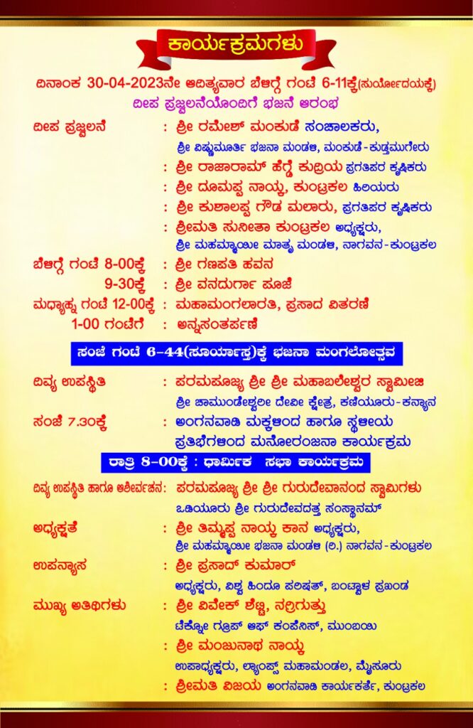 ವೇದಮೂರ್ತಿ ಶ್ರೀ ಶಂಕರನಾರಾಯಣ ಭಟ್ ನಡಿಬೈಲು ಇವರ ನೇತೃತ್ವದಲ್ಲಿ ಕಾರ್ಯಕ್ರಮಗಳು ನಡೆಯಲಿದೆ. ಬೆಳಿಗ್ಗೆ ದೀಪ ಪ್ರಜ್ವಲನೆಯೊಂದಿಗೆ ಅರ್ಧ ಏಕಾಹ ಭಜನೆ ಪ್ರಾರಂಭಗೊಳ್ಳಲಿದ್ದು, ಈ ಕಾರ್ಯಕ್ರಮದಲ್ಲಿ ಶ್ರೀ ವಿಷ್ಣುಮೂರ್ತಿ ಭಜನಾ ಮಂಡಳಿ, ಮಂಕುಡೆ – ಕುಡ್ತಮುಗೇರು ಸಂಚಾಲಕರಾದ ರಮೇಶ್ ಮಂಕುಡೆ, ಪ್ರಗತಿಪರ ಕೃಷಿಕರಾದ ರಾಜಾರಾಮ್ ಹೆಗ್ಡೆ ಕುದ್ರಿಯ, ಹಿರಿಯರಾದ ದೂಮಪ್ಪ ನಾಯ್ಕ ಕುಂಟ್ರಕಲ, ಪ್ರಗತಿಪರ ಕೃಷಿಕರಾದ ಕುಶಾಲಪ್ಪ ಗೌಡ ಮಲಾರು, ಶ್ರೀ ಮಹಮ್ಮಾಯೀ ಮಾತೃ ಮಂಡಳಿ, ನಾಗವನ – ಕುಂಟ್ರಕಲ ಇದರ ಅಧ್ಯಕ್ಷರಾದ ಸುನೀತಾ ಕುಂಟ್ರಕಲ ಭಾಗಿಯಾಗಲಿದ್ದಾರೆ.
