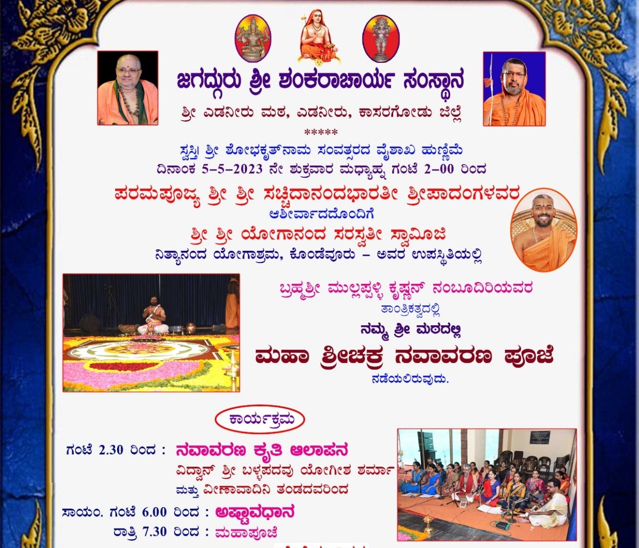 ಜಗದ್ಗುರು ಶ್ರೀ ಶಂಕರಾಚಾರ್ಯ ಸಂಸ್ಥಾನ ಶ್ರೀ ಎಡನೀರು ಮಠದಲ್ಲಿ ಮೇ 05 ರಂದು ಮಹಾ ಶ್ರೀಚಕ್ರ ನವಾವರಣ ಪೂಜೆ ನಡೆಯಲಿದೆ.