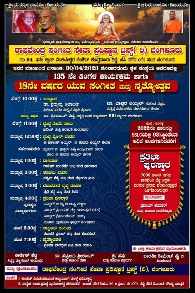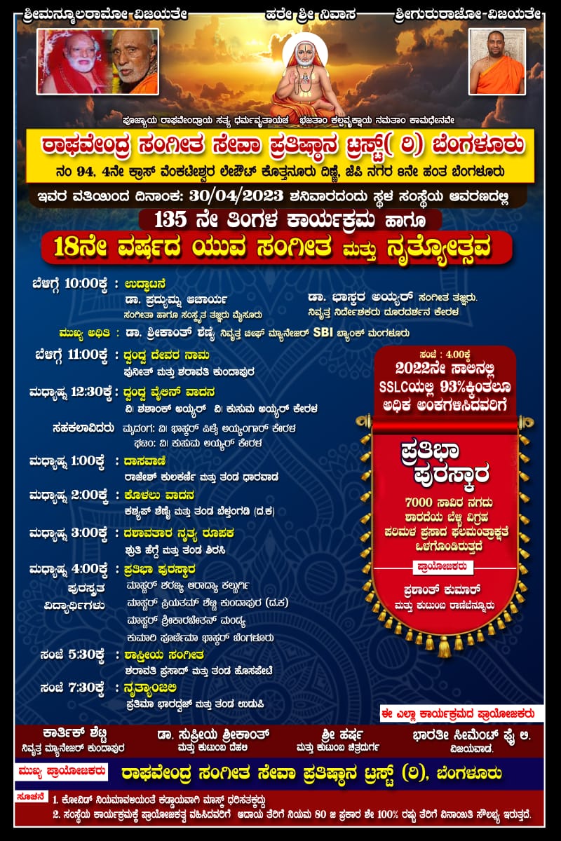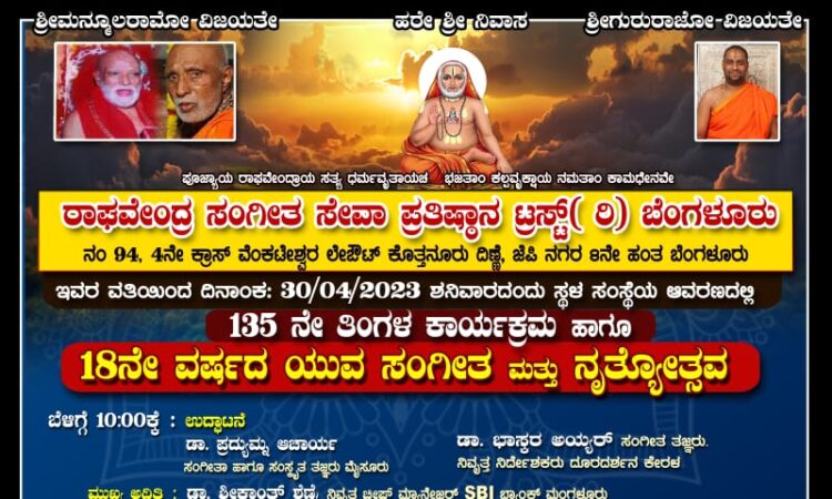 ಬೆಂಗಳೂರು ರಾಘವೇಂದ್ರ ಸಂಗೀತ ಸೇವಾ ಪ್ರತಿಷ್ಠಾನ ಟ್ರಸ್ಟ್(ರಿ) ಇವರ ವತಿಯಿಂದ ಎ 30ರಂದು ಸಂಸ್ಥೆಯ ಆವರಣದಲ್ಲಿ 135ನೇ ತಿಂಗಳ ಕಾರ್ಯಕ್ರಮ ಹಾಗೂ ಮತ್ತು 18ನೇ ವರ್ಷದ ಯುವ ಸಂಗೀತ ಮತ್ತು ನೃತ್ಯೋತ್ಸವ ಕಾರ್ಯಕ್ರಮ ನಡೆಯಲಿದೆ.