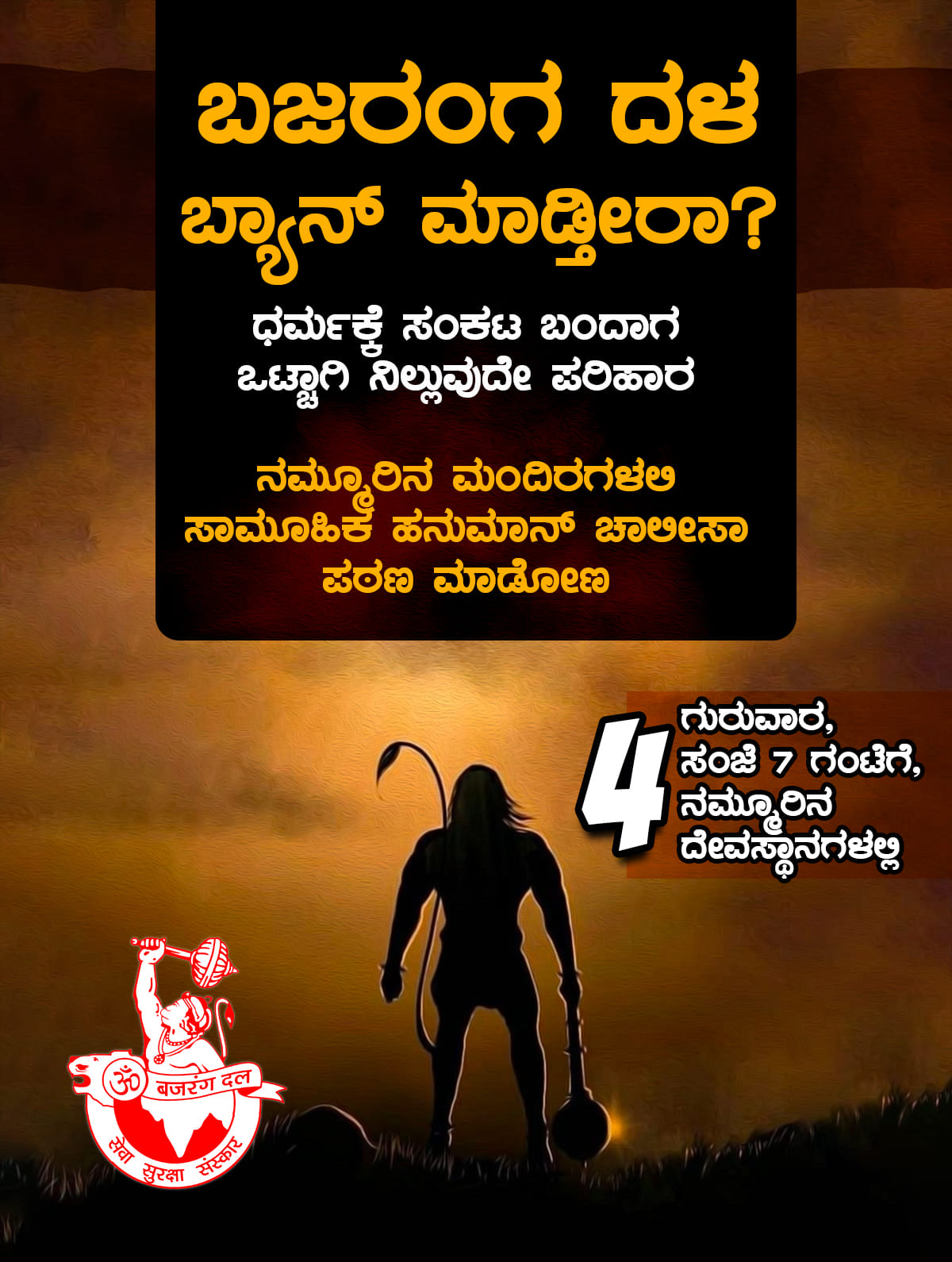 ಈ ಸಂಬಂಧ ಸಾಮಾಜಿಕ ಜಾಲತಾಣದಲ್ಲಿ ಪೋಸ್ಟ್ ಪ್ರಕಟಿಸಿದ ಚಿಂತಕ ಚಕ್ರವರ್ತಿ ಸೂಲಿಬೆಲೆ, ಬಜರಂಗ ದಳ ನಾಳೆ ಸಂಜೆ 7 ಗಂಟೆಗೆ ರಾಜ್ಯದಾದ್ಯಂತ ಸಾಮೂಹಿಕ ಹನುಮಾನ್ ಚಾಲಿಸಾ ಪಠಣವನ್ನು ಆಯೋಜಿಸಿದೆ. ಇದು ಧರ್ಮಕ್ಕೆ ಸಂಕಟವೆರಗಿರುವ ಸಮಯ. ಒಟ್ಟಾಗಿ ನಿಲ್ಲುವುದೊಂದೇ ಪರಿಹಾರ. ನಮ್ಮೆಲ್ಲ ಭೇದಗಳನ್ನು ಒತ್ತಟ್ಟಿಗಿಟ್ಟು ಧರ್ಮರಕ್ಷಣೆಗೆ ಜೊತೆಯಾಗೋಣ, ಕೈ ಜೋಡಿಸೋಣ ಎಂದು ಬರೆದುಕೊಂಡಿದ್ದಾರೆ.
