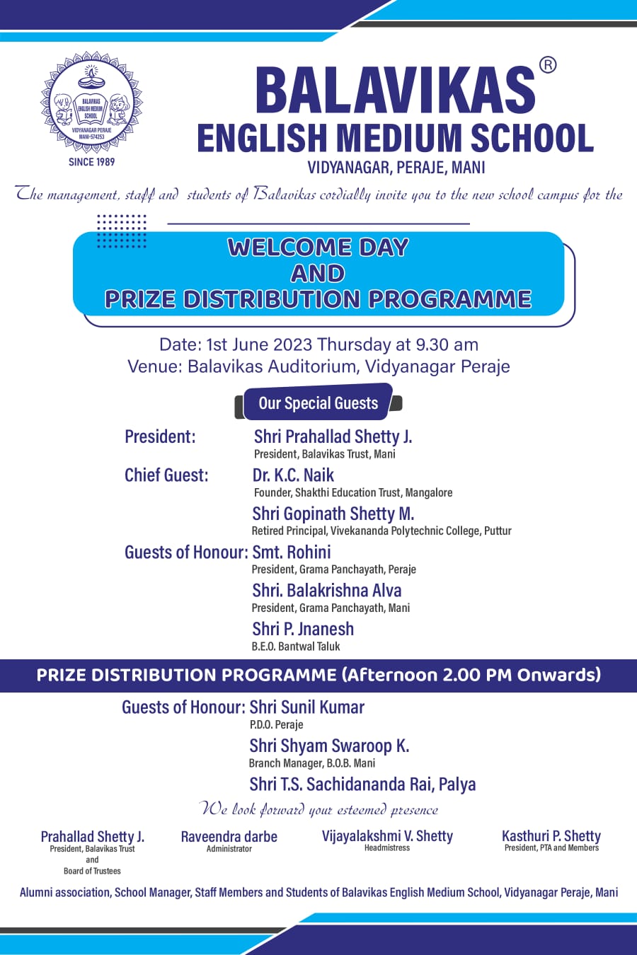 ಈ ಕಾರ್ಯಕ್ರಮದ ಅಧ್ಯಕ್ಷತೆಯನ್ನು ಬಾಲವಿಕಾಸ ಟ್ರಸ್ಟ್ ಅಧ್ಯಕ್ಷ ಪ್ರಹಲ್ಲಾದ್ ಶೆಟ್ಟಿ ಜೆ ಅವರು ವಹಿಸಲಿದ್ದಾರೆ. ಮುಖ್ಯ ಅತಿಥಿಯಾಗಿ ಶಕ್ತಿ ಎಜುಕೇಶನಲ್ ಟ್ರಸ್ಟ್ ಸ್ಥಾಪಕ ಡಾ ಕೆಸಿ ನಾಯ್ಕ್, ಪುತ್ತೂರು ವಿವೇಕಾನಂದ ಪಾಲಿಟೆಕ್ನಿಕ್ ಕಾಲೇಜಿನ ನಿವೃತ್ತ ಪ್ರಾಂಶುಪಾಲರಾದ ಗೋಪಿನಾಥ್ ಶೆಟ್ಟಿ ಎಂ ಭಾಗವಹಿಸಲಿದ್ದಾರೆ,