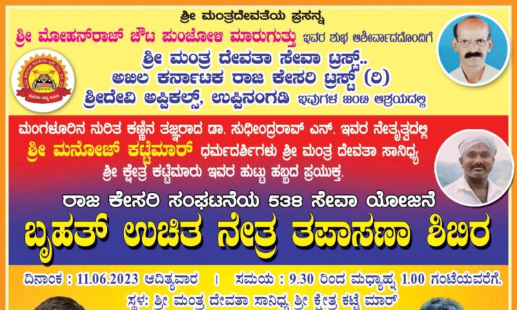 ಶ್ರೀ ಮೋಹನ್ ರಾಜ್ ಚೌಟ ಪುಂಜೋಳಿ ಮಾರುಗುತ್ತು ಇವರ ಶುಭ ಆಶೀರ್ವಾದದೊಂದಿಗೆ, ಶ್ರೀ ಮಂತ್ರ ದೇವತಾ ಸೇವಾ ಟ್ರಸ್ಟ್. ಅಖಿಲ ಕರ್ನಾಟಕ ರಾಜ ಕೇಸರಿ ಟ್ರಸ್ಟ್(ರಿ) ಶ್ರೀ ದೇವಿ ಅಪ್ಪಿಕಲ್ಸ್ ಉಪ್ಪಿನಂಗಡಿ ಇವುಗಳ ಜಂಟಿ ಆಶ್ರಯದಲ್ಲಿ, ಮಂಗಳೂರಿನ ನುರಿತ ಕಣ್ಣಿನ ತಜ್ಞರಾದ ಡಾ.ಸುಧೀಂದ್ರರಾವ್ ಎನ್. ಇವರ ನೇತೃತ್ವದಲ್ಲಿ ಮನೋಜ್ ಕಟ್ಟೆಮಾರ್ ಧರ್ಮದಶೀಗಳು ಶ್ರೀ ಮಂತ್ರ ದೇವತಾ ಸಾನಿಧ್ಯ ಶ್ರೀ ಕ್ಷೇತ್ರ ಕಟ್ಟೆಮಾರು ಇವರ ಹುಟ್ಟು ಹಬ್ಬದ ಪ್ರಯುಕ್ತ ರಾಜ ಕೇಸರಿ, ಸಂಘಟನೆಯ 538 ಸೇವಾ ಯೋಜನೆ ಬೃಹತ್ ಉಚಿತ ನೇತ್ರ ತಪಾಸಣಾ ಶಿಬಿರವನ್ನು ಆಯೋಜಿಸಲಾಗಿದೆ. ಶಿಬಿರವು ಬೆಳಗ್ಗೆ 9;30ರಿಂದ ಮಧ್ಯಾಹ್ನ 1 ಗಂಟೆಯವರೆಗೆ ಶ್ರೀ ಮಂತ್ರ ದೇವÀತಾ ಸಾನಿಧ್ಯ ಶ್ರೀ ಕ್ಷೇತ್ರ ಕಟ್ಟೆಮಾರ್ ನಡೆಯಲಿದೆ.