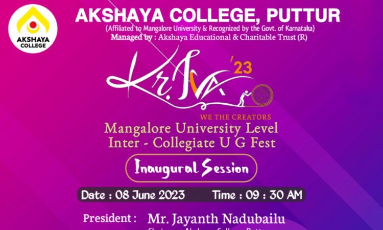 ಪುತ್ತೂರು: ಸಂಪ್ಯದಲ್ಲಿ ಅಕ್ಷಯ ಎಜ್ಯುಕೇಶನಲ್ ಆಂಡ್ ಚಾರಿಟೇಬಲ್ ಟ್ರಸ್ಟ್ ಆಶ್ರಯದಲ್ಲಿ ಕಾರ್ಯಾಚರಿಸುತ್ತಿರುವ ಅಕ್ಷಯ ಕಾಲೇಜಿನಲ್ಲಿ ಇದೇ ಬರುವ ಜೂ.8 ರಂದು ಮಂಗಳೂರು ವಿಶ್ವವಿದ್ಯಾನಿಲಯ ಮಟ್ಟದ ಪದವಿ ಕಾಲೇಜುಗಳ ಅಂತರ್-ಕಾಲೇಜು ಮ್ಯಾನೇಜ್ಮೆಂಟ್ ಹಾಗೂ ‘ಸಾಂಸ್ಕೃತಿಕ ಫೆಸ್ಟ್’ ನಡೆಯಲಿದೆ.