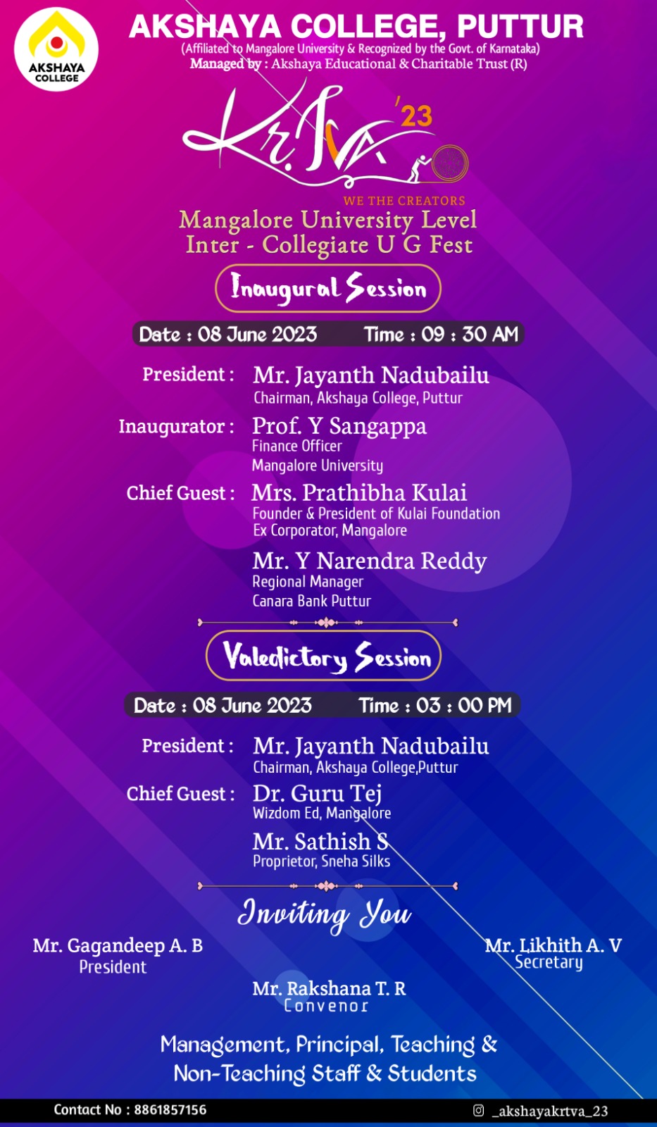 ಇನ್ನು ಕಾಲೇಜಿನಲ್ಲಿ ಸಂಜೆ ಸಮಾರೋಪ ಕಾರ್ಯಕ್ರಮ ಆಯೋಜನೆಗೊಂಡಿದ್ದು, ಅಕ್ಷಯ ಕಾಲೇಜಿನ ಚೇರ್ ಮ್ಯಾನ್ ಜಯಂತ್ ನಡುಬೈಲುರವರು ಅಧ್ಯಕ್ಷತೆ ವಹಿಸಲಿದ್ದಾರೆ. ಅತಿಥಿಗಳಾಗಿ ಮಂಗಳೂರಿನ ವಿಝ್ಡಮ್ ಎಡ್ ನ ಡಾ|ಗುರು ತೇಜ್, ಪುತ್ತೂರು ಸ್ನೇಹ ಸಿಲ್ಕ್ಸ್ನ ಮಾಲಕ ಸತೀಶ್ ಎಸ್.ರವರು ಭಾಗವಹಿಸಲಿದ್ದಾರೆ ಎಂದು ಅಕ್ಷಯ ಕಾಲೇಜಿನ ಫೆಸ್ಟ್ ಇದರ ಸಂಯೋಜಕ ರಕ್ಷಣಾ ಟಿ.ಆರ್, ವಿದ್ಯಾರ್ಥಿ ಸಂಘದ ಅಧ್ಯಕ್ಷ ಗಗನ್ ದೀಪ್ ಎ.ಬಿ, ಕಾರ್ಯದರ್ಶಿ ಲಿಖಿತ್ ಎ.ವಿರವರು ಮಾಹಿತಿ ನೀಡಿದ್ದಾರೆ.