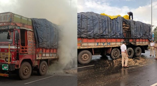 ಪಂಚರ್ ಆದ ಟಯರ್ನಿಂದ ಲಾರಿಗೆ ಬೆಂಕಿ ಹತ್ತಿಕೊಂಡಿದ್ದು, ಸ್ಥಳಕ್ಕೆ ಕೂಡಲೇ ಅಗ್ನಿಶಾಮಕ ದಳ ಧಾವಿಸಿ ಕಾರಣ ಅನಾಹುತ ತಪ್ಪಿಸಿದೆ. ಜೋಳ ತುಂಬಿದ್ದ ಲಾರಿಯ ಪಂಚರ್ ಆದ ಬಳಿಕ ಟಯರ್ಗೆ ಬೆಂಕಿ ಹತ್ತಿದೆ ಎಂದು ತಿಳಿದು ಬಂದಿದೆ.