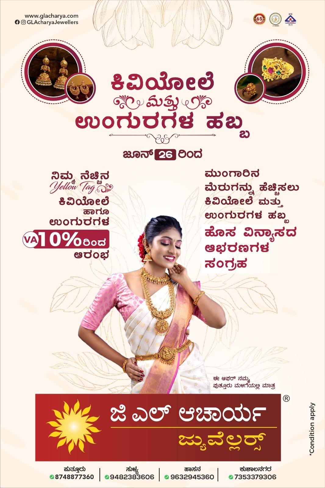 ಸ್ವರ್ಣೋದ್ಯಮದಲ್ಲಿ 66 ವರ್ಷಗಳಿಂದ ಜನಮನ ಗೆದ್ದು, ಚಿನ್ನಾಭರಣ ಪ್ರಿಯರ ಮನೆಮಾತಾಗಿ ಕರಾವಳಿ ಹಾಗೂ ಮಲೆನಾಡುಗಳಲ್ಲಿ ವಿಶಿಷ್ಟ ಛಾಪು ಮೂಡಿಸಿರುವ ಜಿ.ಎಲ್. ಆಚಾರ್ಯ ಜ್ಯುವೆಲ್ಲರ್ ‘ಕಿವಿಯೋಲೆ ಮತ್ತು ಉಂಗುರಗಳ ಹಬ್ಬ’ ಏರ್ಪಾಡಿಸಿದ್ದು, ಮುಂಗಾರಿನ ಮೆರುಗನ್ನ
