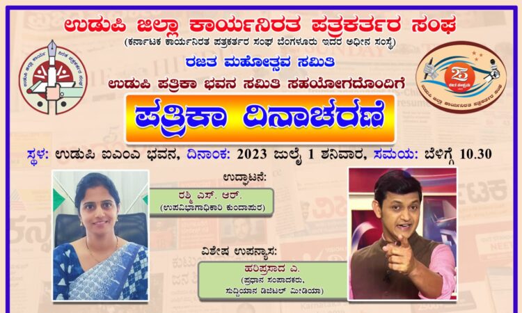 ಉಡುಪಿ : ಉಡುಪಿ ಜಿಲ್ಲಾ ಕಾರ್ಯನಿರತ ಪತ್ರಕರ್ತರ ಸಂಘ ರಜತ ಮಹೋತ್ಸವ ಸಮಿತಿ, ಉಡುಪಿ ಪತ್ರಿಕಾ ಭವನ ಸಮಿತಿಯ ಸಹಯೋಗ ದೊಂದಿಗೆ ಪತ್ರಿಕಾ ದಿನಾಚರಣೆಯನ್ನು ಉಡುಪಿ ಐಎಂಎ ಭವನದಲ್ಲಿ ಜು.1ರಂದು ಬೆಳಗ್ಗೆ 10.30ಕ್ಕೆ ಹಮ್ಮಿಕೊಳ್ಳಲಾಗಿದೆ.