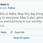 ಈದ್-ಉಲ್-ಅಧಾ ದ ಶುಭಾಶಯಗಳು. ಈ ದಿನ ಎಲ್ಲರಿಗೂ ಸಂತೋಷ ಮತ್ತು ಸಮೃದ್ಧಿಯನ್ನು ತರಲಿ. ಇದು ನಮ್ಮ ಸಮಾಜದಲ್ಲಿ ಒಗ್ಗಟ್ಟು ಮತ್ತು ಸಾಮರಸ್ಯದ ಮನೋಭಾವವನ್ನು ಎತ್ತಿ ಹಿಡಿಯಲಿ ಈದ್ ಮುಬಾರಕ್ ಎಂದು ಟ್ವಿಟರ್ ಮೂಲಕ ಪ್ರಧಾನಿ ಮೋದಿ ಶುಭಾಶಯಗಳನ್ನು ತಿಳಿಸಿದ್ದಾರೆ.