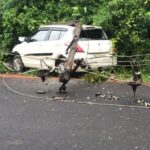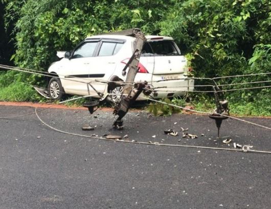 ವಿದ್ಯುತ್ ಕಂಬಕ್ಕೆ ಕಾರು ಡಿಕ್ಕಿ ಹೊಡೆದ ರಭಸಕ್ಕೆ ವಿದ್ಯುತ್ ಕಂಬ ಕಾರಿನ ಮೇಲೆ ಬಿದ್ದಿದ್ದು ಯಾವುದೇ ಅಪಾಯವಿಲ್ಲದೆ ಭಾರಿ ಅವಘಡ ತಪ್ಪಿದೆ.