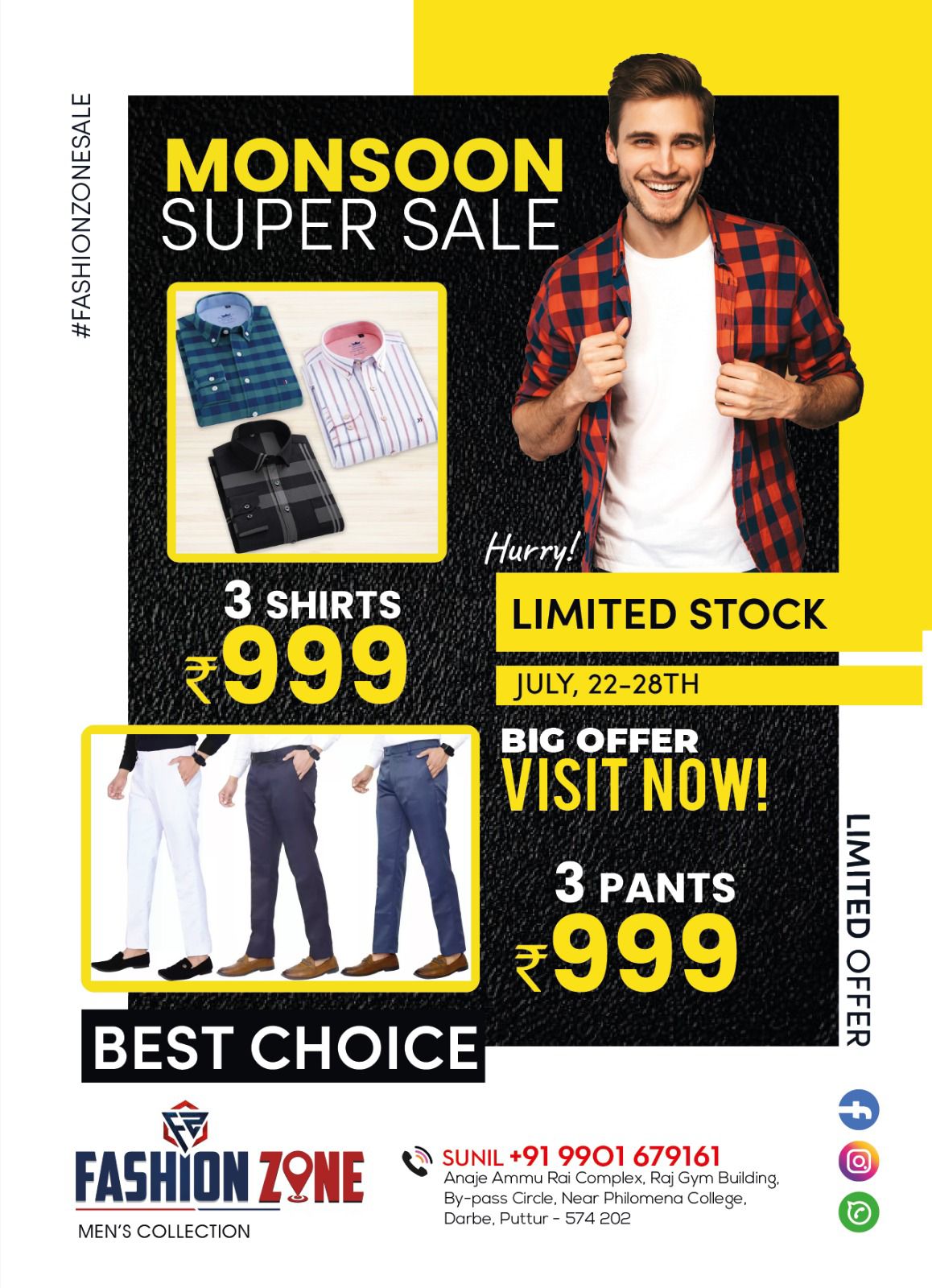 ಪುರುಷರ 3 ಶರ್ಟ್ಗಳು ಅಥವಾ 3 ಪ್ಯಾಂಟ್ಗಳನ್ನ ಕೇವಲ 999 ರೂಪಾಯಿಗೆ ಖರೀದಿಸಬಹುದಾಗಿದೆ. ವಿನೂತನ ಬಟ್ಟೆಗಳ ಕಲೆಕ್ಷನ್ ಹೊಂದಿರುವ ಪುತ್ತೂರಿನ ಹೆಸರಾಂತ ಫ್ಯಾಶನ್ ಝೋನ್ ಮಳಿಗೆಯಲ್ಲಿ ಗುಣಮಟ್ಟದ ಉಡುಪುಗಳಿಗೆ ಬಿಗ್ ಆಫರ್ ನೀಡಲಾಗಿದೆ. ಫ್ಯಾಶನ್ ಝೋನ್ಗೆ ಇಂದೇ ಭೇಟಿ ನೀಡಿ.