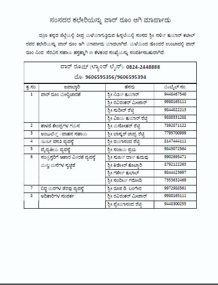 ದಕ್ಷಿಣ ಕನ್ನಡ ಜಿಲ್ಲೆಯಲ್ಲಿ ತೀವ್ರ ಮಳೆಯಾಗುತ್ತಿರುವ ಹಿನ್ನಲೆಯಲ್ಲಿ ಬಿಜೆಪಿ ರಾಜ್ಯಧ್ಯಕ್ಷರು, ಸಂಸದರಾದ ನಳಿನ್ ಕುಮಾರ್ ಕಟೀಲ್ರವರ ಕಛೇರಿಯನ್ನು ವಾರ್ ರೂಂ ಆಗಿ ಮಾರ್ಪಾಡು ಮಾಡಲಾಗಿದೆ. ಮಳೆಯಿಂದ ತೊಂದರೆ ಉಂಟಾದಲ್ಲಿ ವಾರ್ ರೂಂನಿoದ ನೆರವಿನ ಸಹಾಯ ಹಸ್ತಕ್ಕಾಗಿ ಜನತೆ ವಾರ್ ರೂಮ್ (ಲ್ಯಾಂಡ್ ಲೈನ್): 0824-2448888, ಮೊಬೈಲ್: 9606595356/9606595394 ಈ ಸಂಖ್ಯೆಯನ್ನು ಸಂಪರ್ಕಿಸಬಹುದಾಗಿದೆ.