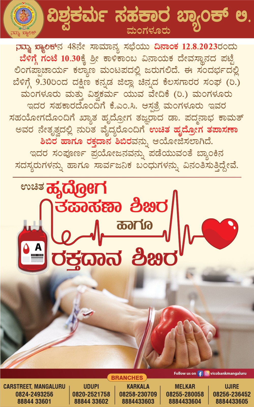 ವಿಶ್ವಕರ್ಮ ಸಹಕಾರ ಬ್ಯಾಂಕ್ ಲಿ ಮಂಗಳೂರು ಇದರ 48ನೇ ಸಾಮಾನ್ಯ ಸಭೆಯು ಆಗಸ್ಟ್ 12ರಂದು ಬೆಳಗ್ಗೆ 10.30ಕ್ಕೆ ಶ್ರೀ ಕಾಳಿಕಾಂಬ ವಿನಾಯಕ ದೇವಸ್ಥಾನದ ಪಟ್ಟೆ ಲಿಂಗಪ್ಪಾಚಾರ್ಯ ಕಲ್ಯಾಣ ಮಂಟಪದಲ್ಲಿ ಜರುಗಲಿದೆ. ಈ ಸಂದರ್ಭದಲ್ಲಿ ಬೆಳಗ್ಗೆ 9.30ರಿಂದ ದಕ್ಷಿಣ ಕನ್ನಡ ಜಿಲ್ಲಾ ಚಿನ್ನದ ಕೆಲಸಗಾರರ ಸಂಘ ರಿ. ಮಂಗಳೂರು ಮತ್ತು ವಿಶ್ವಕರ್ಮ ಯುವ ವೇದಿಕೆ ರಿ. ಮಂಗಳೂರು ಇದರ ಸಹಕಾರದೊಂದಿಗೆ ಖ್ಯಾತ ಹೃದ್ರೋಗ ತಜ್ಞರಾದ ಡಾ ಪದ್ಮನಾಭ ಕಾಮತ್ ಅವರ ನೇತೃತ್ವದಲ್ಲಿ ನುರಿತ ವೈದ್ಯರೊಂದಿಗೆ ಉಚಿತ ಹೃದ್ರೋಗ ತಪಾಸಣಾ ಶಿಬಿರ ಹಾಗೂ ರಕ್ತದಾನ ಶಿಬಿರವನ್ನು ಆಯೋಜಿಸಲಾಗಿದೆ. ಇದರ ಸಂಪೂರ್ಣ ಪ್ರಯೋಜನವನ್ನು ಪಡೆಯುವಂತೆ ಬ್ಯಾಂಕಿನ ಸದಸ್ಯರುಗಳನ್ನು ಹಾಗೂ ಸಾರ್ವಜನಿಕರಲ್ಲಿ ವಿನಂತಿಸಿಕೊಂಡಿದ್ದಾರೆ.