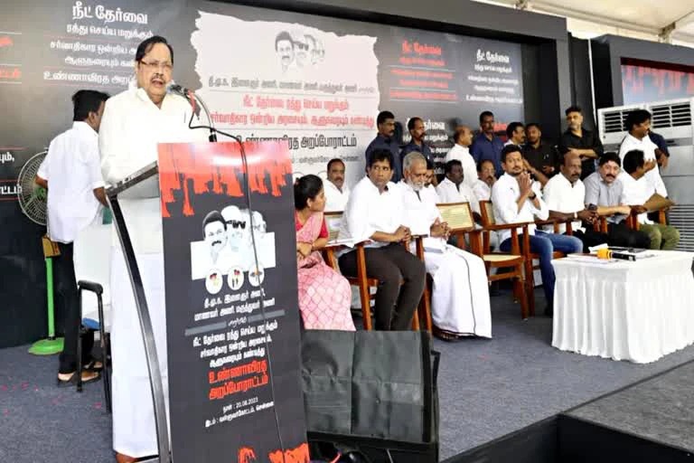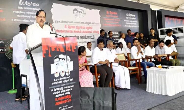 ಸಿಎಂ ಪುತ್ರನ ನೇತೃತ್ವದಲ್ಲಿ ಹೋರಾಟ: ಸಚಿವ, ಸಿಎಂ ಸ್ಟಾಲಿನ್ ಅವರ ಪುತ್ರ ಉದಯನಿಧಿ ಸ್ಟಾಲಿನ್ ನೇತೃತ್ವದಲ್ಲಿ ಈ ಹೋರಾಟ ನಡೆಯುತ್ತಿದೆ. ಇಂದಿನಿAದ ರಾಜ್ಯಾದ್ಯಂತ ನೀಟ್ ವಿರುದ್ಧ ಉಪವಾಸ ಸತ್ಯಾಗ್ರಹ ಆರಂಭಿಸಲಾಗಿದೆ. ಇಲ್ಲಿನ ವಳ್ಳುವರ್ ಕೊಟ್ಟಂನಲ್ಲಿ ನಡೆದ ಪ್ರತಿಭಟನೆಯಲ್ಲಿ ಸಚಿವರಾದ ದುರೈಮುರುಗನ್, ಸುಬ್ರಮಣಿಯನ್ ಮತ್ತು ಪಿ.ಕೆ.ಸೇಕರ್ ಬಾಬು ಸೇರಿದಂತೆ ಪಕ್ಷದ ಸಂಸದರು, ಶಾಸಕರು ಮತ್ತು ಚೆನ್ನೈ ಮೇಯರ್ ಕೂಡ ಭಾಗವಹಿಸಿದ್ದರು.