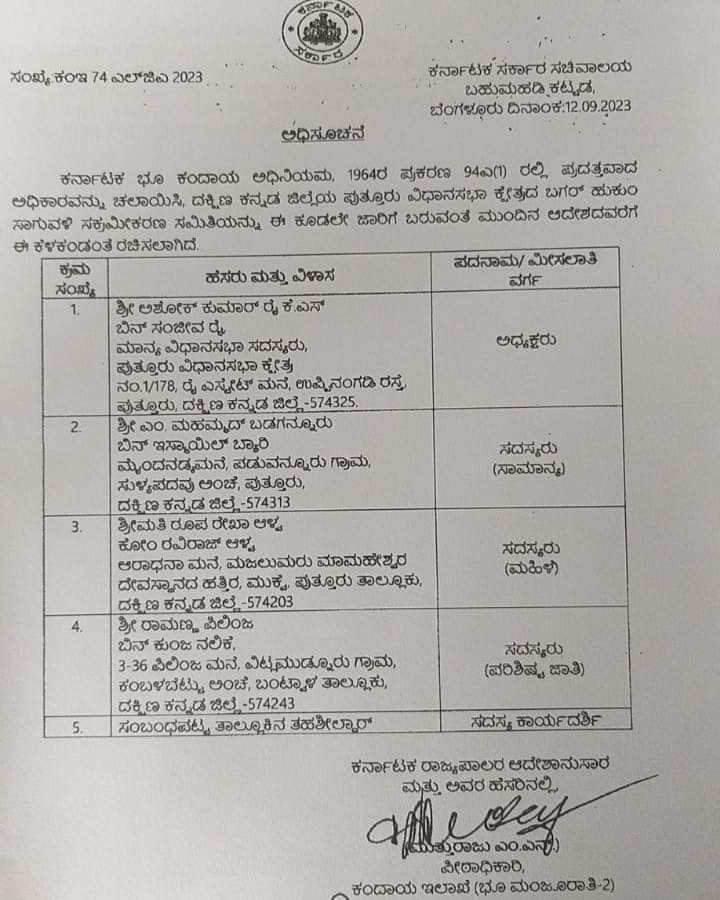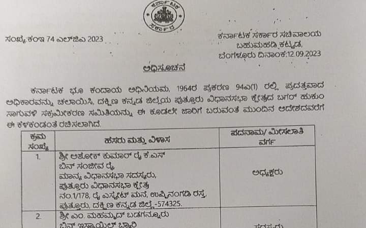 ಪುತ್ತೂರು : ಕರ್ನಾಟಕ ಭೂಕಂದಾಯ ಅಧಿನಿಯಮ 1964ರ ಪ್ರಕರಣ 94ಎ(1) ರ ಪ್ರದತ್ತವಾದ ಅಧಿಕಾರವನ್ನ ಚಲಾಯಿಸಿ, ಸರ್ಕಾರದ ಮುಂದಿನ ಆದೇಶ ಬರುವವರೆಗೆ ಪುತ್ತೂರು ವಿಧಾನಸಭಾ ಕ್ಷೇತ್ರದ ಬಗರ್ ಹುಕುಂ ಸಾಗುವಳಿ ಸಕ್ರಮೀಕರಣ ಸಮಿತಿಯ ಸದಸ್ಯರನ್ನು ನೇಮಕ ಮಾಡಲಾಗಿದೆ.
