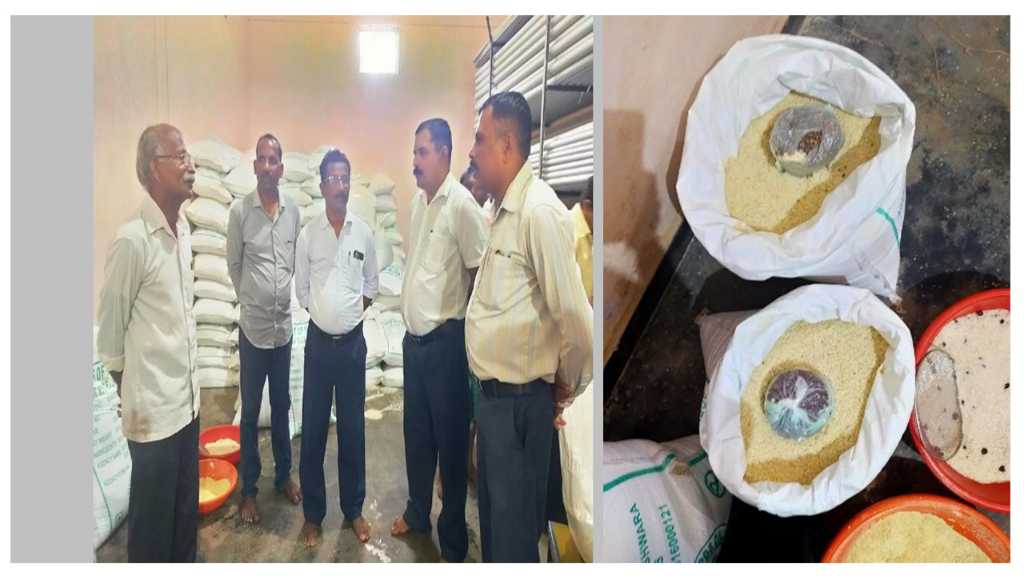 ಅಲoಕಾರಿನಲ್ಲಿರುವ ಆಹಾರ ಇಲಾಖೆಯ ಗೋದಾಮಿನಿಂದ ಪ್ಲಾಸ್ಟಿಕ್ ಬ್ಯಾಗ್ ನಲ್ಲಿ ತುಂಬಿಸಿದ್ದ 300 ಅಕ್ಕಿ ಮೂಟೆ ಕೊಯಿಲ ಪಡಿತರ ವಿಭಾಗಕ್ಕೆ ಸೋಮವಾರ ಸರಬರಾಜು ಆಗಿದೆ. ಬುಧವಾರ ಬೆಳಿಗ್ಗೆ ಪಡಿತರ ವಿತರಿಸಲು ಚೀಲ ತೆರೆದಾಗ 4 ಗೋಣಿ ಚೀಲದಲ್ಲಿ ಹುಣಸೆ ಬೀಜ, ಪ್ಲಾಸ್ಟಿಕ್ ಲಕೋಟೆಯಲ್ಲಿ ತುಂಬಿದ ಕೆಂಪು ಕಲ್ಲು, ಗೋದಿ ಮಿಶ್ರಣದ ದೇವರ ಪ್ರಸಾದ ರೀತಿಯಲ್ಲಿರುವ ವಸ್ತುಗಳು ಇರುವುದು ಕಂಡುಬoದಿವೆ. ಗುರುವಾರ ಮತ್ತೆ ಒಂದು ಚೀಲದಲ್ಲಿ ಇಂಥದೇ ವಸ್ತುಗಳು ಪತ್ತೆಯಾಗಿದೆ.
