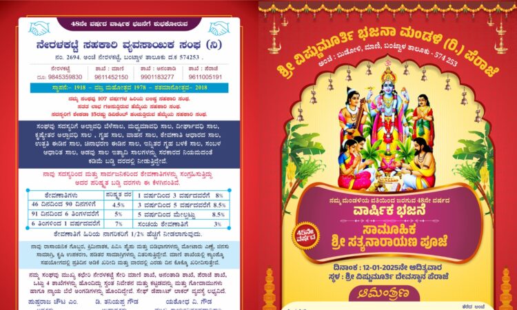 ಜ.12ರಂದು ಶ್ರೀ ವಿಷ್ಣುಮೂರ್ತಿ ಭಜನಾ ಮಂಡಳಿ(ರಿ.) ಪೆರಾಜೆ ವತಿಯಿಂದ 48ನೇ ವರ್ಷದ ವಾರ್ಷಿಕ ಭಜನೆ ಹಾಗೂ 45 ನೇ ವರ್ಷದ ಸಾಮೂಹಿಕ ಸತ್ಯನಾರಾಯಣ ಪೂಜೆ –ಕಹಳೆ ನ್ಯೂಸ್